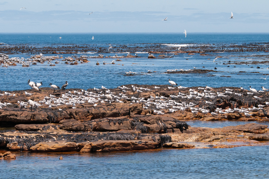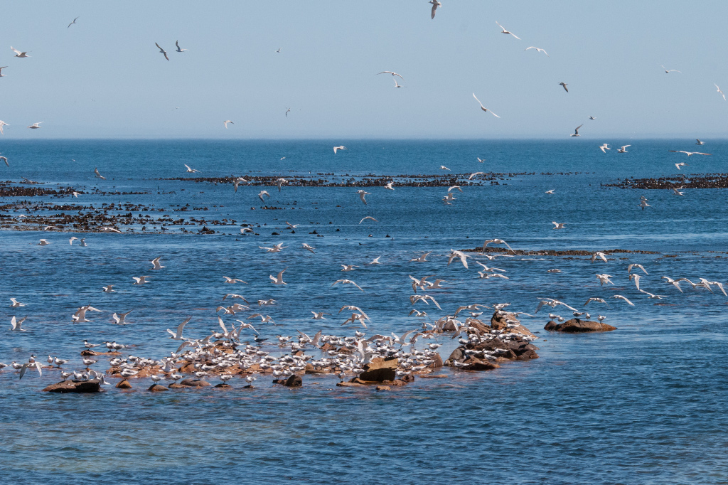 Having dropped Gerda off at the hairdresser, I set off to explore the pentad covering Kommetjie (a pentad being 5 x 5 minutes in degrees latitude/longitude or about 8 x 8 kms in extent) – about 90% of this pentad is in fact in the sea, so atlasing is limited to a part of Kommetjie jutting into the pentad in the south-east corner. I stopped at the first beach area I came across and was immediately struck by the numbers of seabirds flying past and, looking for their source, noticed huge colonies of them further out on the exposed rocks. Swift Terns and Hartlaub’s Gulls were especially abundant, numbering in the hundreds if not a thousand or more and making quite a sight.