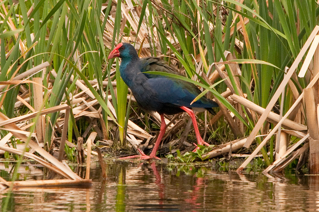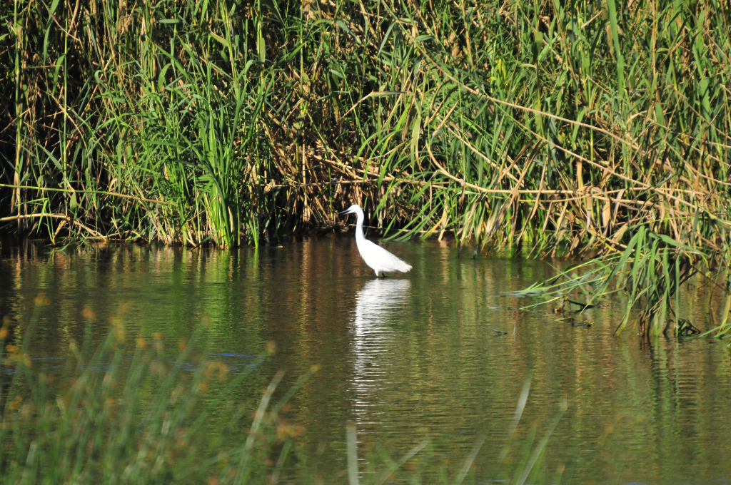 There were not many waders present as suitable wading territory is limited, but the ubiquitous Three-banded Plover was present, not far from an African Purple Swamphen making his way carefully through the reed fringes. On a smaller pond, a hide allowed me to observe a Little Egret in action without disturbing it.