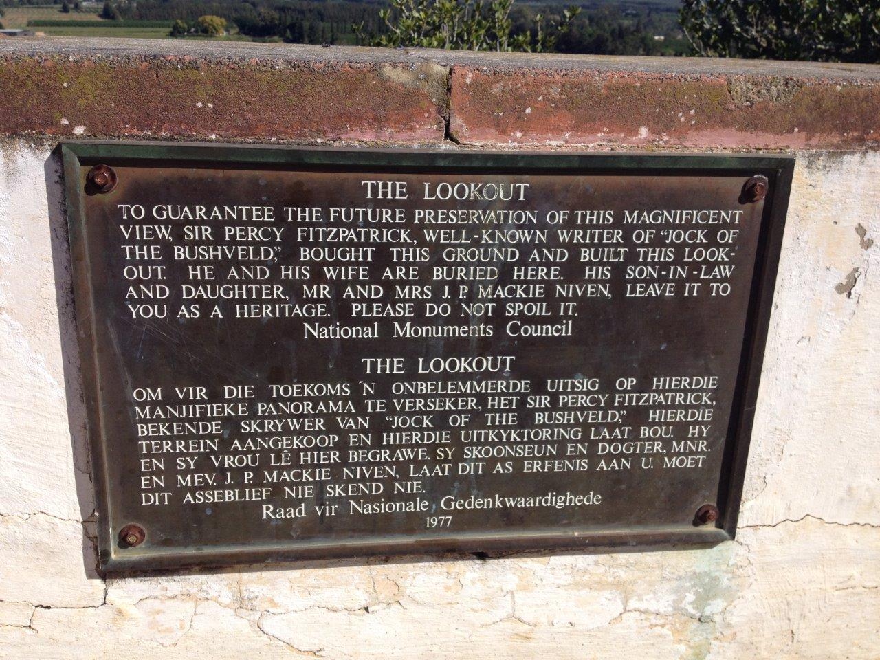 Having a 3 hour gap before we could move into our Forest cabin, we decided to go in search of the grave of Percy Fitzpatrick, author of the classic story of Jock of the Bushveld, which we had heard was not far from Addo Elephant Park, off the road to Kirkwood. Passing through the village of Addo we spotted a building with the name ‘Percy Fitzpatrick Library’ and immediately stopped to find out more – good thing because the very helpful librarian was more than willing to chat about the library, the area and showed us a portfolio of historical photos in a large album kept by the library. She also pointed us in the right direction to the grave site and ‘Lookout’.