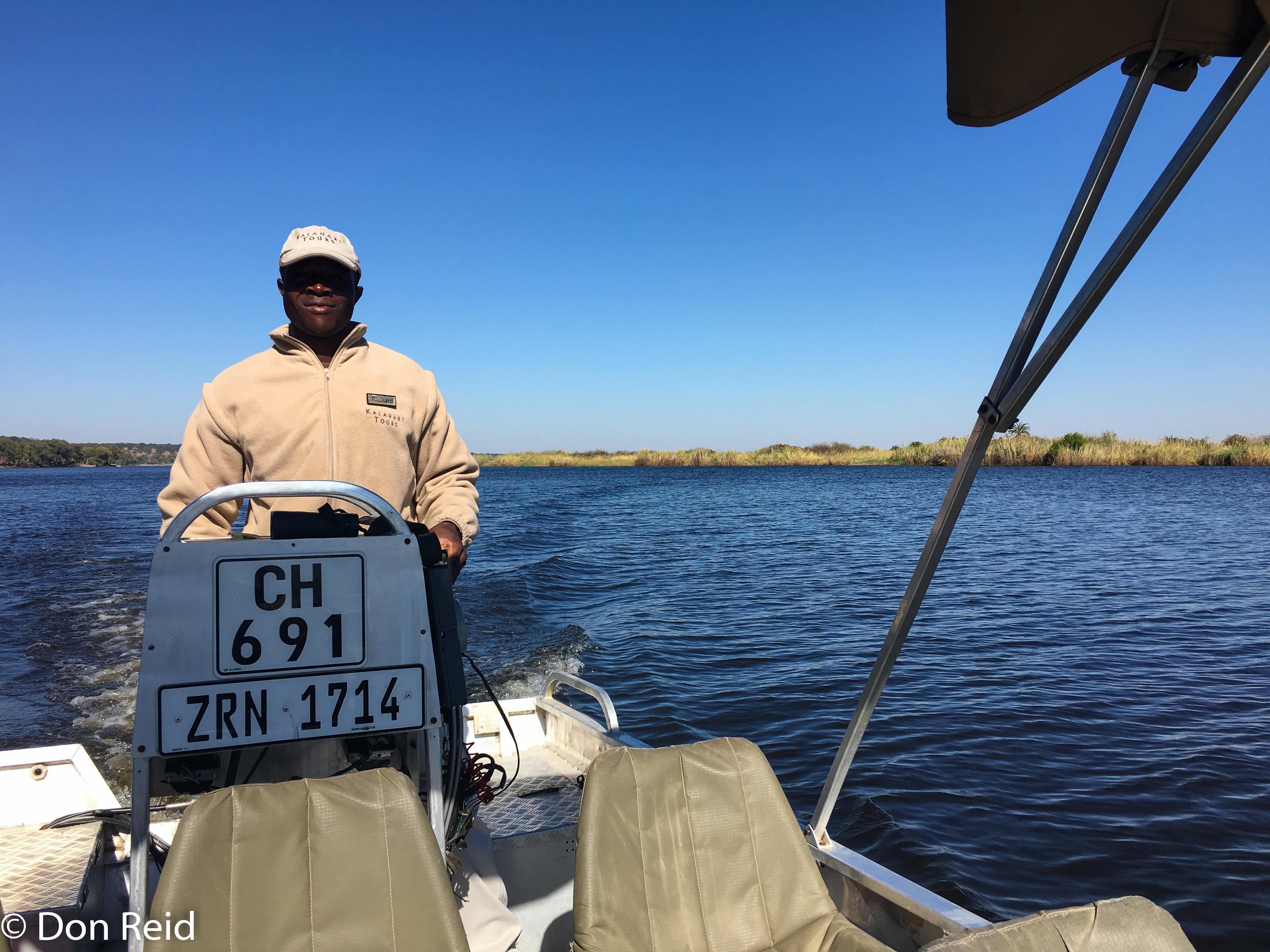 The boat was of aluminium construction, sturdy looking, hopefully Hippo-proof and fitted with 2 rows of three comfy seats with a fold-down canopy over. I took up position in the middle seat of the front row, being the only guest that morning, doing my best to look as if this was my customary position in all boats I travelled in, and spread my gear on the adjoining seats.