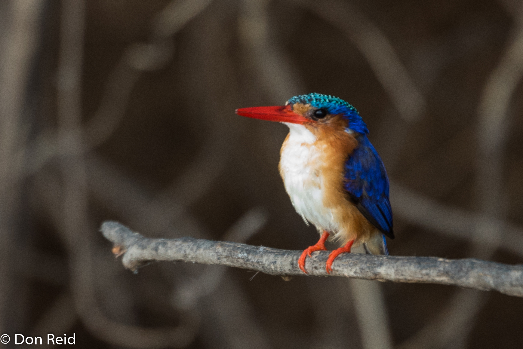 Once I was sated with the spectacular bird life at the rapids, I indicated to Richard that we could proceed and he headed upstream, staying close enough to the banks to spot birds in the overhanging reeds, bushes and trees. His eyes proved sharper than mine as he spotted and pointed out everything from the tiny Malachite Kingfishers to their larger cousin the Giant Kingfisher, not to mention Brown-hooded Kingfishers.