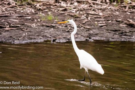 Rounding a bend, the river was once again visible ahead and several larger birds in the shallows made me approach cautiously, using the trees as a partial screen where possible. The slender, graceful form of a Great Egret on the near side was a familiar sight, looking identical to the SA version of this large all-white egret. The Australian bird book I use has it as Eastern Great Egret and some taxonomists consider it to be a subspecies but there were no features that I could pick up to differentiate it from the Southern African bird.