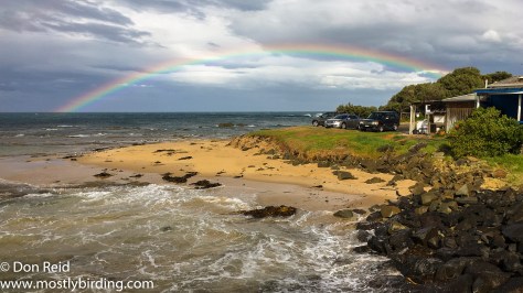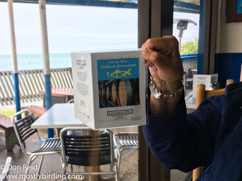 By 1pm we reached Lorne, having travelled all of 42 km in two and a bit hours! I turned off to have a look at the Lorne Pier and fortuitously found our lunch spot for the day right next to the pier – aptly named Lorne Pier Seafood Restaurant. There was a light drizzle and strong wind whipping up the sea which, combined with a rainbow that suddenly appeared, made for a pleasing scene.