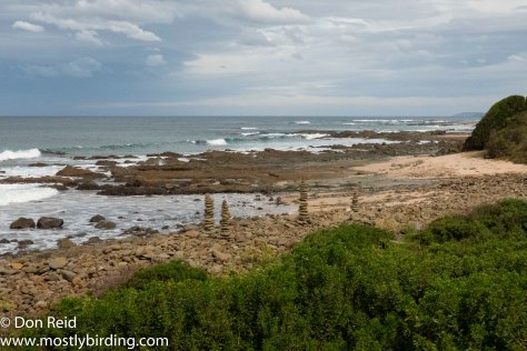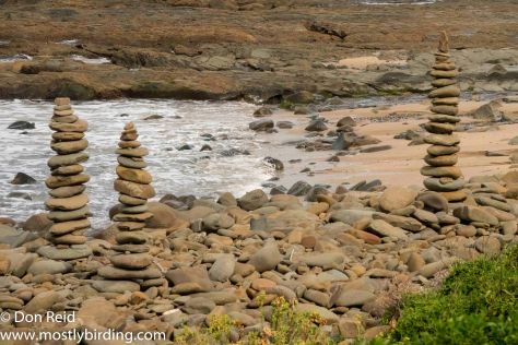 Just a few kms further the beach changed again – this time to a rock and boulder strewn expanse and, when I stopped to have a closer look, we noticed carefully stacked columns of varying sized stones forming cairns at one end of the beach. It seems someone started stacking these columns and others continued, for no particular reason other than creating an interesting feature.