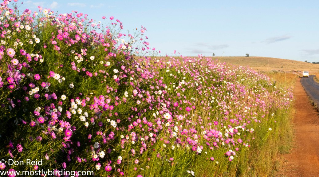 Initially, after turning off the highway, I travelled slowly along the quieter R104 road that runs parallel to the N4. This proved to be a good move with plenty of birds apparent along the verges, in and on the long grass and bush, even among the banks of colourful Cosmos flowers in pastel shades that emerge at this time of year.