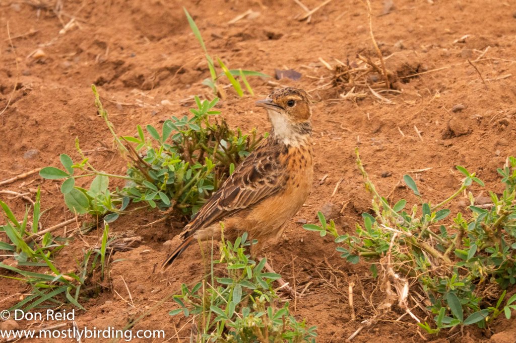 Spike-heeled Larks have two features which set them apart from similar looking larks – a short, white-tipped tail and a white throat – both are visible in this image. The longish decurved bill is another feature of the species but less obvious in this image.