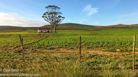 Just after passing the neat little farm house in the photo below, I came to a field of green lucerne where Ibises – Sacred and Hadeda – stood out as they worked there way along, bent over to pluck morsels from the soil. A farmer stopped to find out what I was up to (as they are wont to do) and we got into a conversation on the area, the weather and recent drought that was now improving. He happened to have the same surname as my son-in-law and knew of him and the family, which generated more discussion of course.
