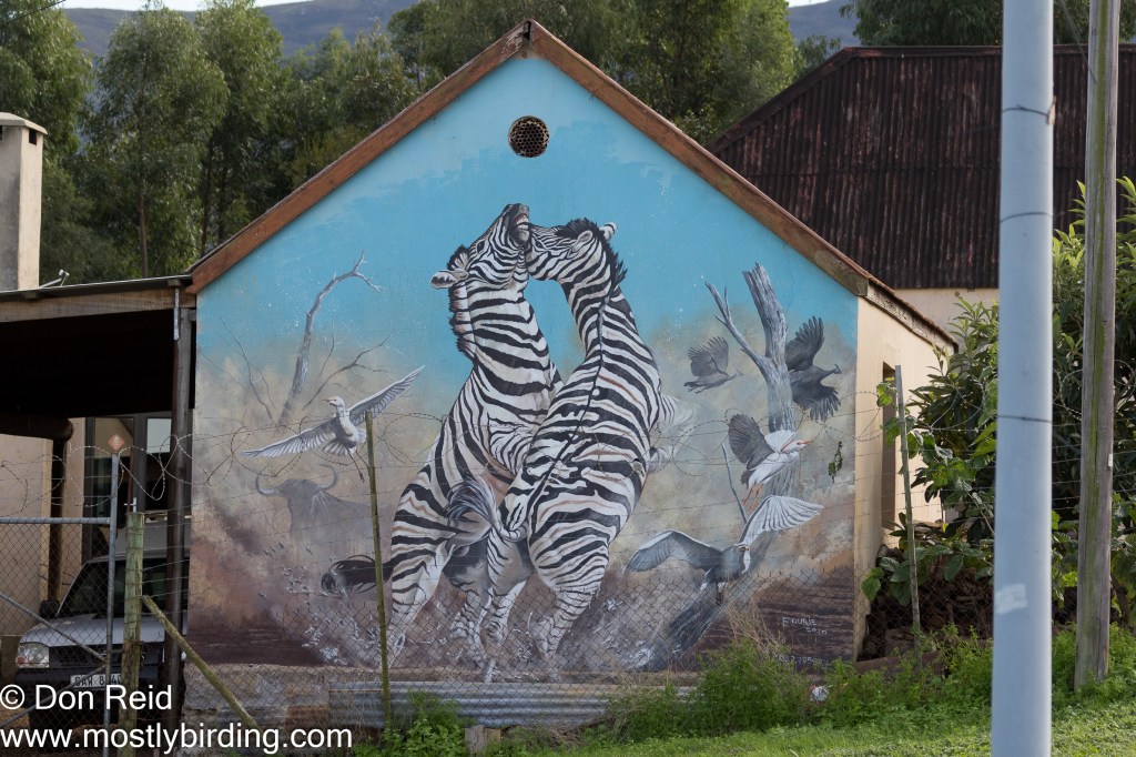 The street-facing wall of this rather modest home provides the ‘canvas’ for a dramatic scene of a fight between two Zebras, with dust being kicked up and birds being forced to scatter