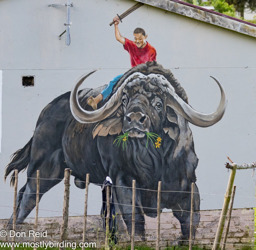 This mural on the side wall of another home is quite fanciful – Buffaloes are known as one of the most dangerous animals and hardly suited to being ridden by a young lad as depicted here. Nevertheless an imaginative mural brilliantly executed