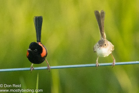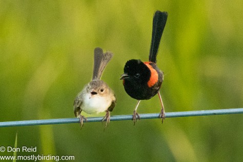 A pair of Fairy-Wrens put on a show which had me chuckling at their antics on a fence wire – clearly some sort of wooing was going on as the male pranced about on the wire and repeatedly leapt over the female to present himself from both sides