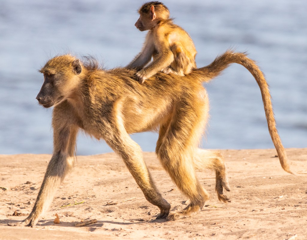 Chacma Baboons are always a delight to watch, such as this youngster riding like a jockey on Mother’s back