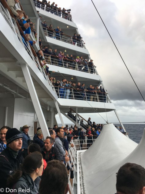 However that was not quite the last of the birding – after dinner at 10.30 pm I went to deck 6 starboard where it was said Great Shearwaters were feeding and sure enough there they were, up to seven visible at a time, feeding near the ship’s side, drawn to it by the lights.