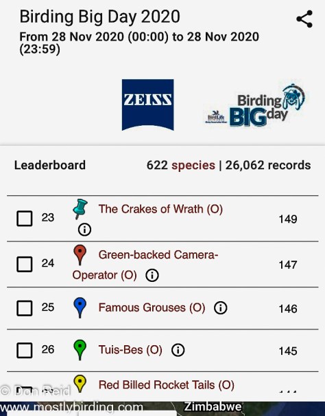 Birdlasser, the amazing birdlisting and atlasing app developed in South Africa, keeps track of every sighting of every team and can be easily accessed during the day to see where the team stands in comparison with the other 300 plus teams across the country.
