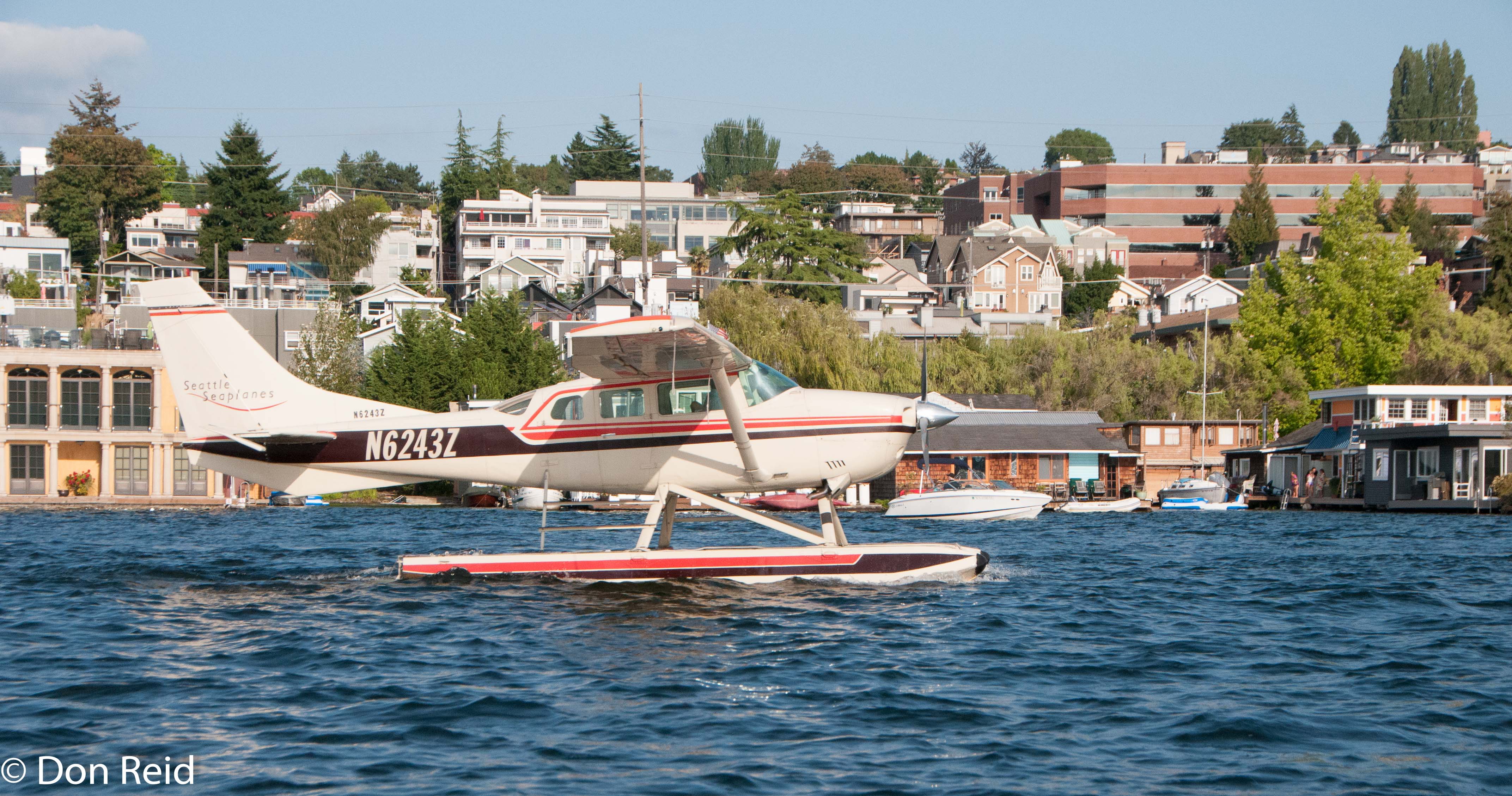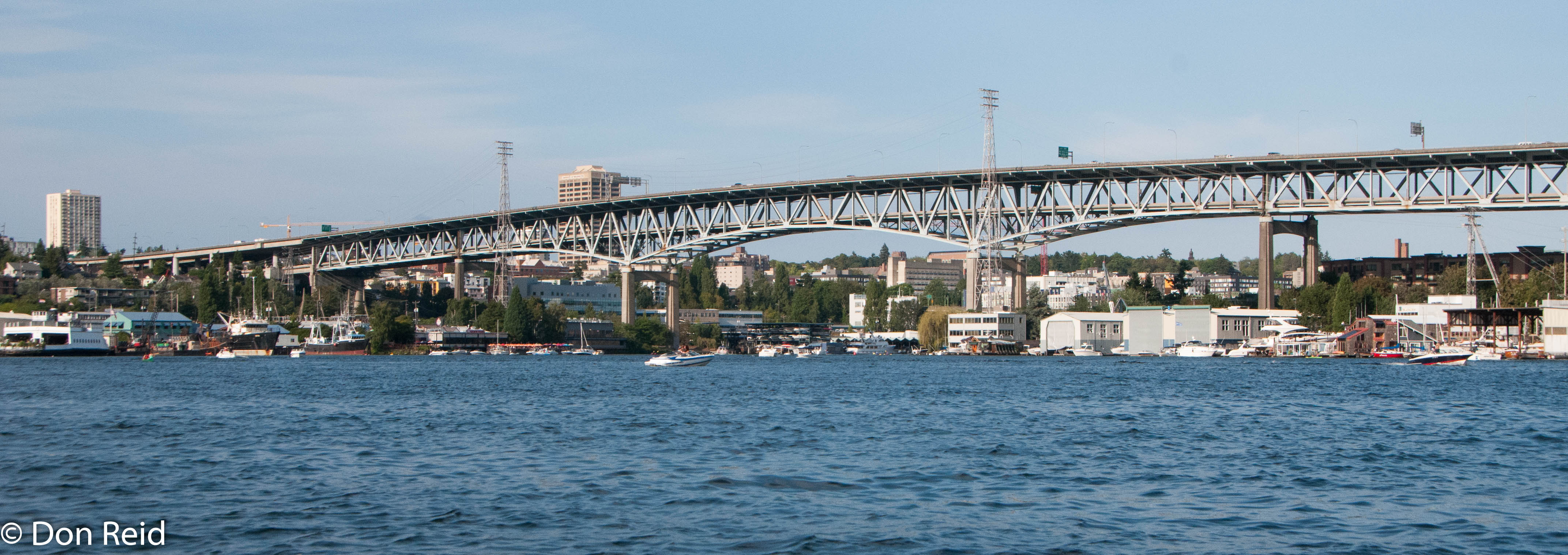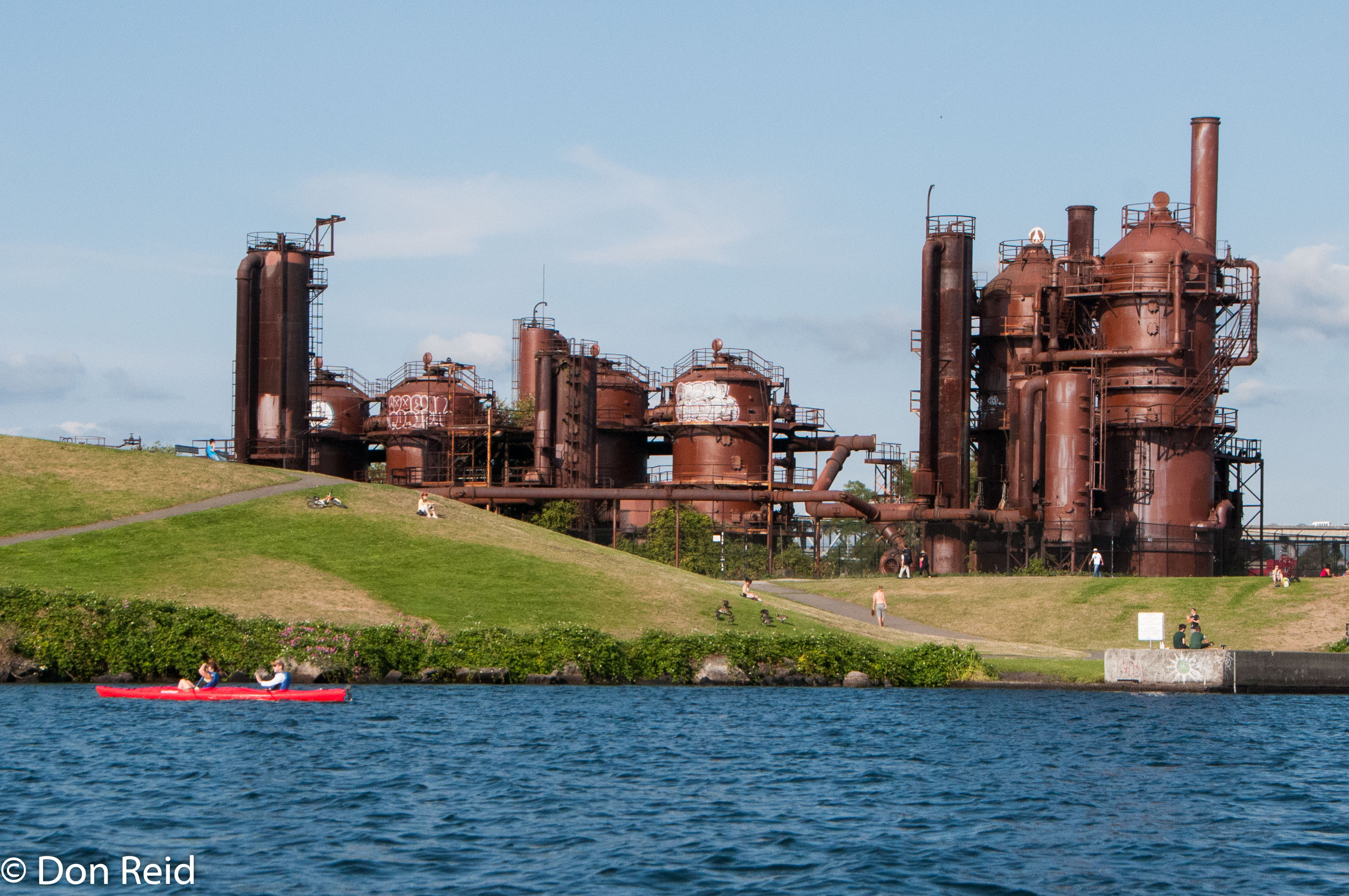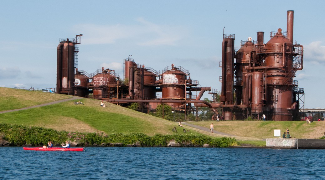 The old gasworks (1906 – 1956) now part of a parkThe city skyline from the lakeSeattle city skylineSeaplanes aboundInterstate 5 Ship Canal bridge
