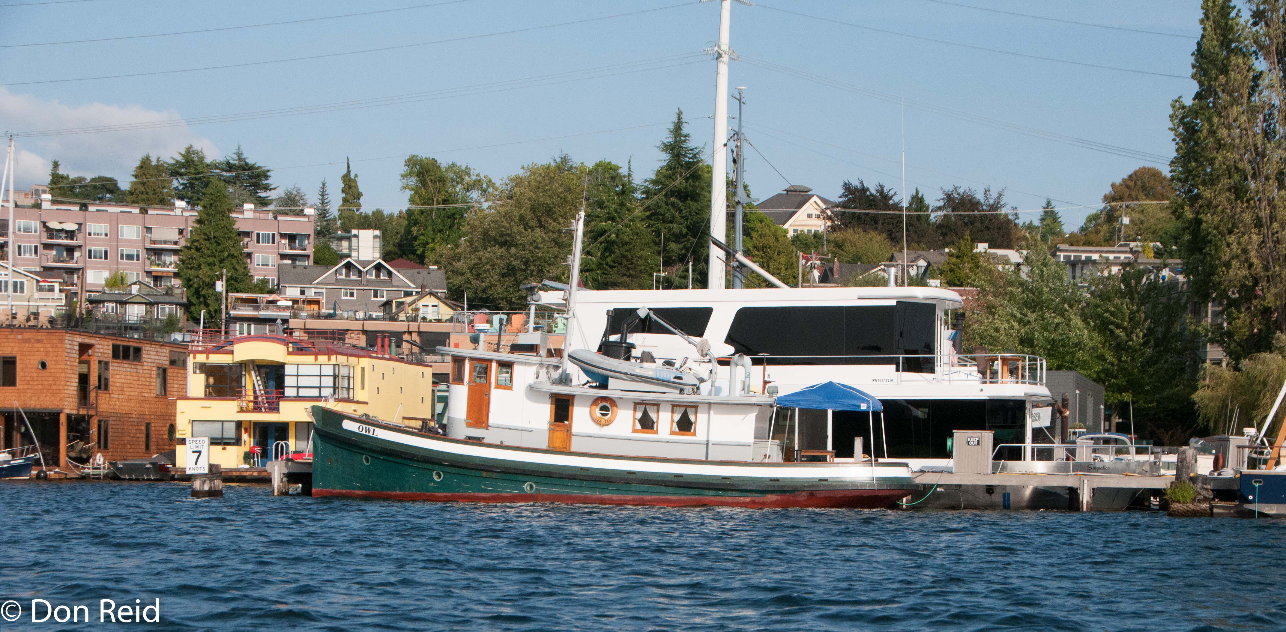 Seattle – Touring the harbour – a floating houseSeattle – Touring the harbour – houseboats and floating housesOne girl – and a dog – in a boat