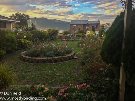 Next morning we awoke to cold, overcast weather which brought squalls of rain at regular intervals. We took our time enjoying the continental breakfast provided in the room, hoping the weather would improve. Our room overlooked the front garden which provided a lively source of entertainment as numerous birds visited the bird-friendly plants.