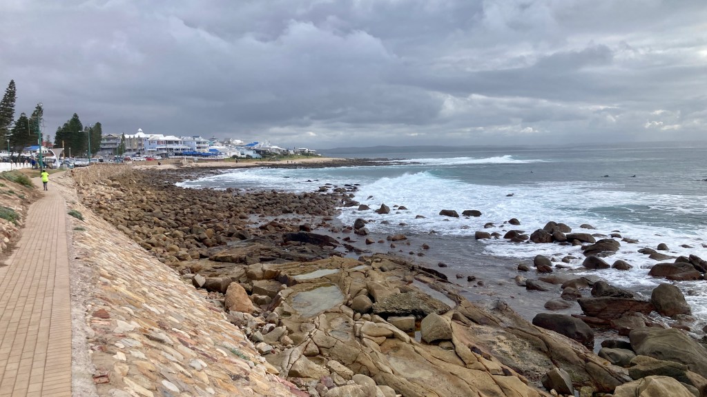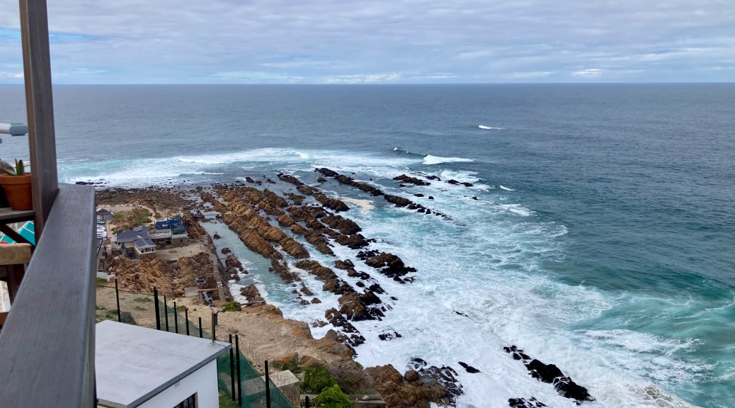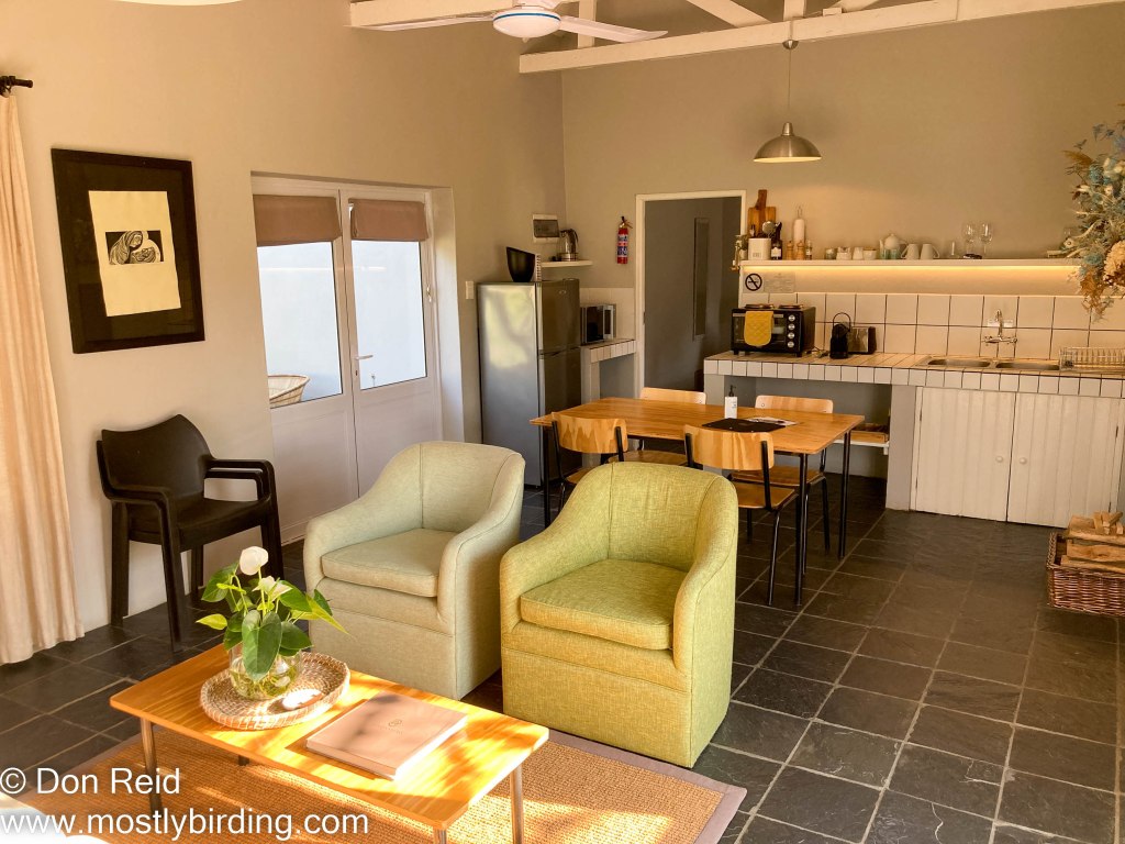 The last stretch to Paternoster was in light rain and we reached our booked accommodation – Paternoster Dunes Guest House – around 3 pm where we were welcomed and soon settled in. They serve coffee/tea and cake every afternoon at 4 pm so we climbed the single flight of stairs up to the dining area and lounge which has magnificent views across the beach and beyond.