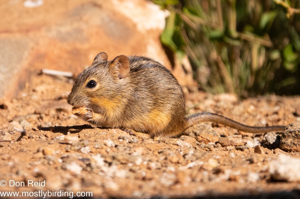 Striped Mice crept cautiously out of the low bushes to grab a morsel in front of the stoep, scurrying back to safety at the slightest movement. Using very slow hand/camera movements I was able to get a few shots of these cute creatures. They are also known as four-striped mice based on the four characteristic black longitudinal stripes down their back.
