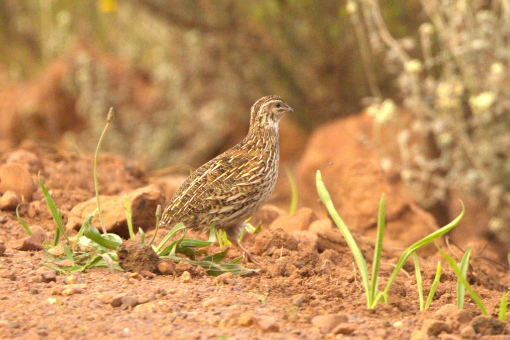 I was out atlasing in the early morning not far from our new home in Mossel Bay and heard the familiar call of Common Quail almost every time I stopped. There were numbers of Larks and other birds in the gravel road and along the verges, then I noticed something different up ahead and raised my binos once more – it was a Common Quail, in fact a pair that were walking along the edge of the gravel amongst grass tufts.