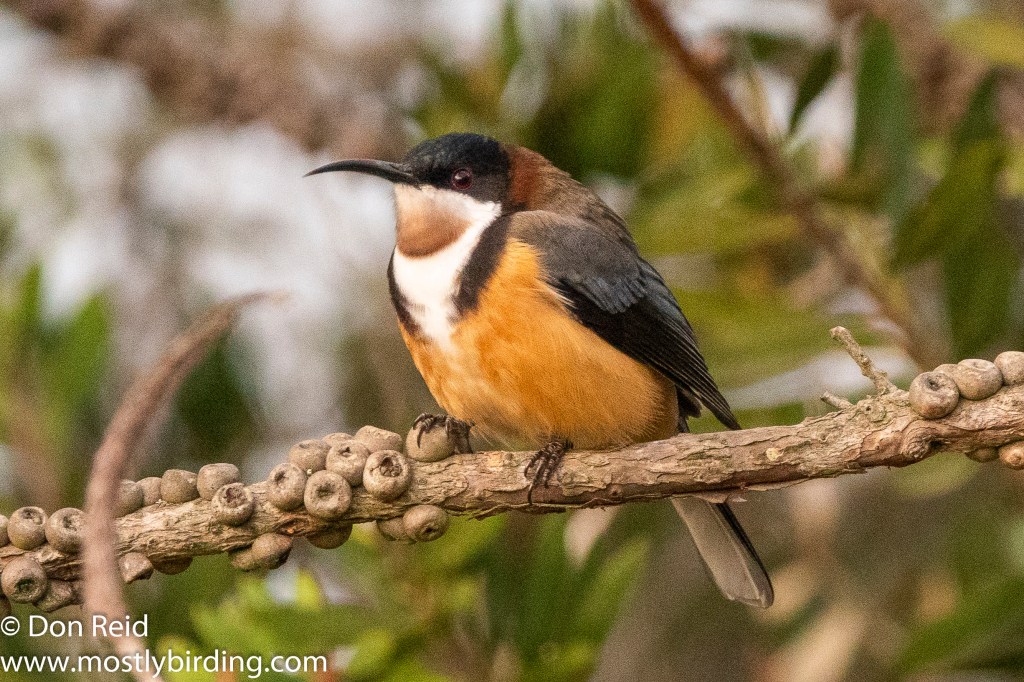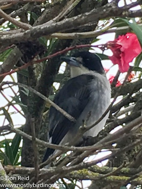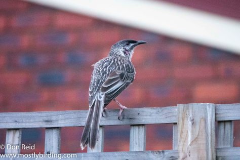 It’s named for the red wattles just below its cheeks, not visible in my photo so you’ll have to use your imagination. A member of the extensive honeyeater family of birds, this is one of the largest and possibly noisiest as well, using its harsh, grating cough or bark to announce its presence in the neighbourhood. It’s the avian equivalent of that aggressive hell’s angel type who roars through the suburbs creating a cacophany of sound.