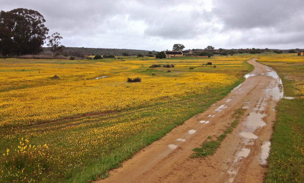 We had arrived at De Lande guest farm, not far from Niewoudtville, the previous day and were nicely settled in the “Sinkhuisie” just a stone’s throw from the main house. After a hearty breakfast in the main house we wondered whether to venture out into the rainy weather, but having come all the way to this part of South Africa, did not want to waste the opportunity and so we set off for Papkuilsfontein some 10Km further down the gravel road. By this time it had been raining for 12 hours and the road, which unfortunately had just been scraped and leveled by the local authorities, had turned to slush and it became an anxious trip as my vehicle, a VW Touareg, slipped and slid in all directions on the greasy surface, despite being in 4 x 4 mode – something like a fried egg in a non-stick frying pan. Mud splatter from the unavoidable pools of water obscured the windscreen and it was a battle to see where we were heading. Amazingly there were still some hardy birds about to keep our list going and make something of our bird atlasing efforts, with Southern Red Bishops , Yellow Bishops, Cape and Yellow Canaries carrying on their activities alongside the road. Under the circumstances the Touareg handled the conditions well but looked quite bedraggled when we stopped at Papkuilsfontein farm.
