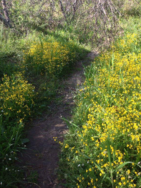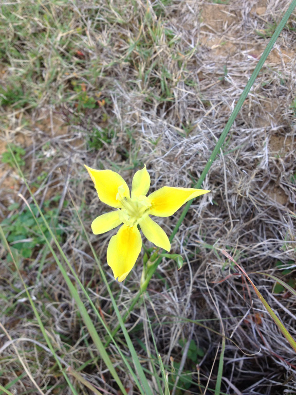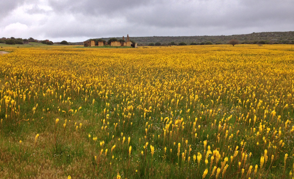 After some consultation with the farm owners, Willem and Mariette van Wyk, we followed their suggested route, which traverses the farm down towards the river, past the cottages which they rent out. Approaching the cottages, we were rewarded with a wonderful sight of yellow “cat’s tail” flowers carpeting the fields, with the backdrop of the stone cottages and the ruins of an old homestead giving the scene a feeling of being in the middle of a beautiful landscape painting. Tearing ourselves away, we carried on for a few Kms into more rocky countryside with a variety of natural flowers and plants vying for attention with their range of colours and forms.