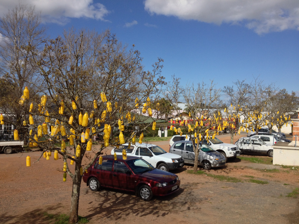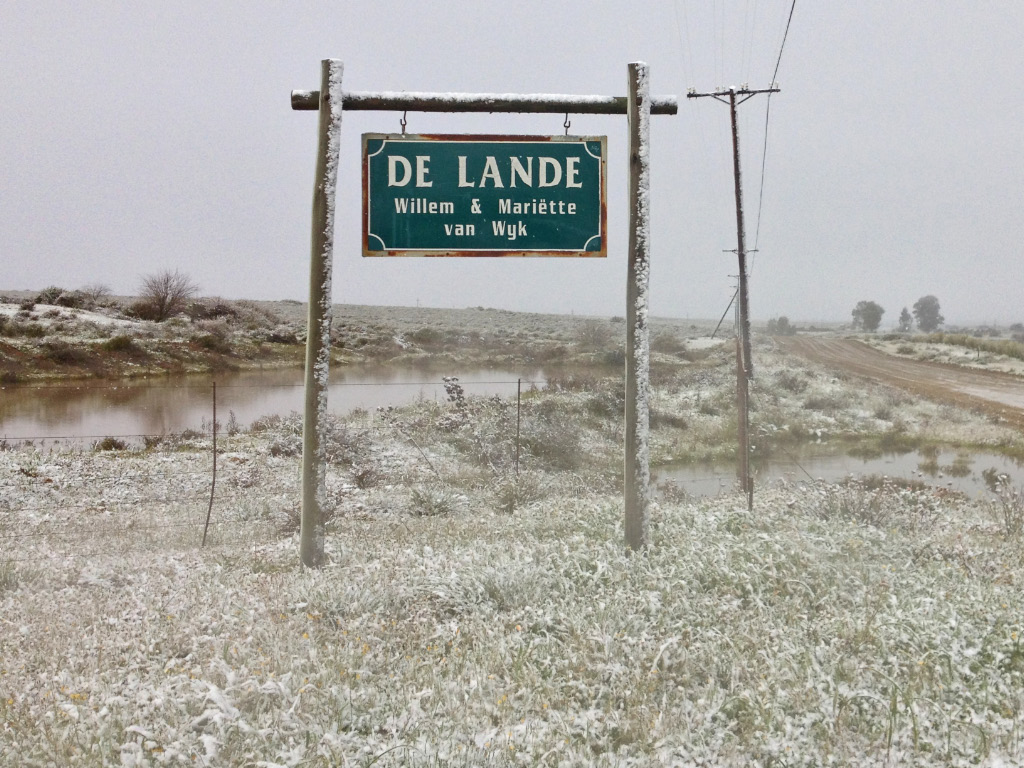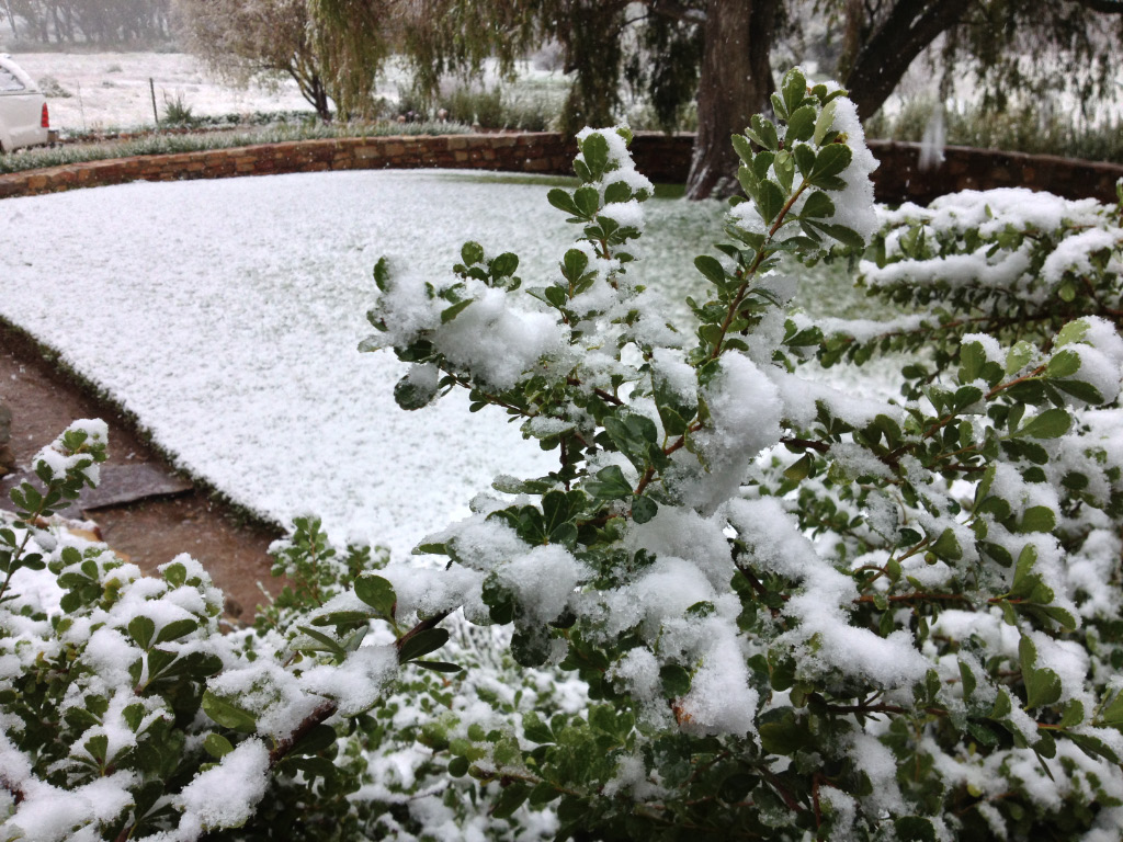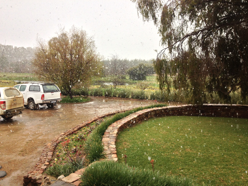 We were up early to pack and load the vehicles for a quick getaway after breakfast, so that we would not be rushed on the longish drive to Simon’s Town (near Cape Town) and have time for a celebratory lunch on the West coast along the way. The temperature gauge in the car showed 3°C and a watery sun was trying its best to break through the low clouds. It was just after 8h00 when we got to the breakfast table at the main house, only to be greeted by rain which quickly turned to sleet and then, magically, it started snowing heavily. This prompted everyone in the dining room to rush out and take photos and just feel the large flakes drifting down and settling on the garden and on our clothes – a unique experience in South Africa and particularly this part, where the 27-year-old waitress informed us she had never seen snow in her life. Within 20 minutes the garden and our vehicles were covered in a layer of snow which was very photogenic, but we couldn’t help thinking of the 13Km of slushy gravel road we had to negotiate to get to the nearest tar road and wondered what added dimension the snow would bring to the experience.