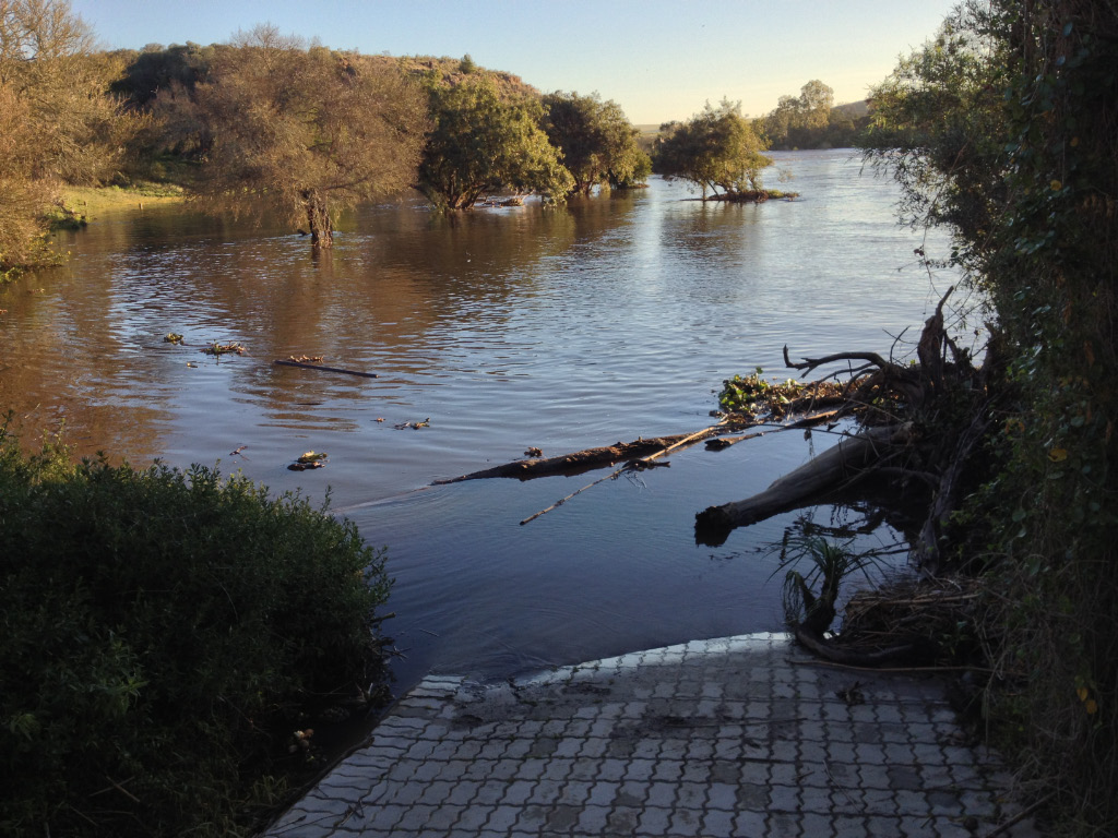 After yesterday’s rough and windy seas, today was the complete opposite and I couldn’t help wishing we had been blessed with this weather for the pelagic trip – hopefully next time? By the time we reached Houw Hoek pass it was lunchtime and it was an easy decision to stop at the roadside farmstall for a simple but delicious lunch with good coffee. From there it was a short hop to Swellendam and the nearby Bontebok National Park – on the way in a Dusky Indigobird caught my eye where it sat on the roadside wire – an unusual sighting for the area which produced an “Out of Range” form when I later submitted the atlas card. Further on a Black Harrier flew low over the scrub as we approached the park reception. After checking in we proceeded to the riverside chalets for a 2 night stay – the wooden chalets are set on a bend in the Breede River which was in flood from the recent heavy rain and snow in the catchment area and it stayed that way during our stay. The partly submerged trees and pathways were an indication of just how high the river was compared to its normal state.