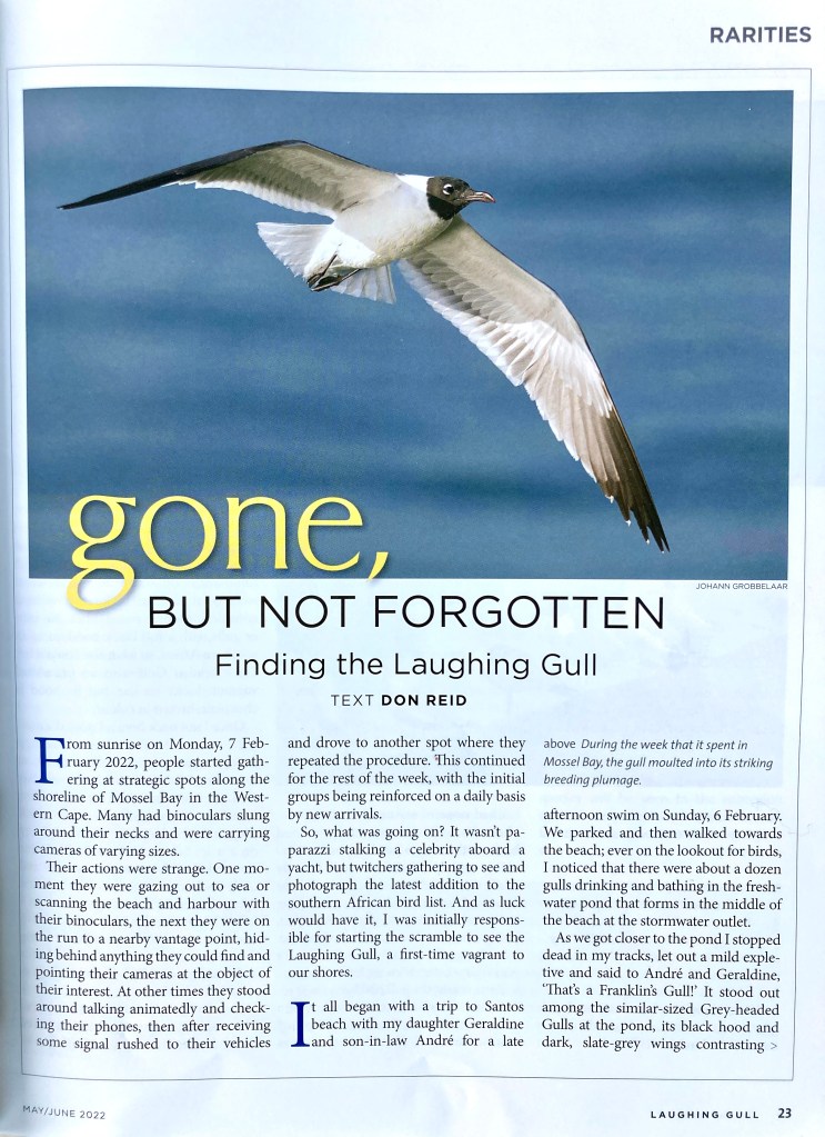 Earlier in the year I wrote about my “Once in a birder’s lifetime” experience of finding a new species for the Southern African region, namely a very far off course Laughing Gull which stayed in Mossel Bay for a week before disappearing again.