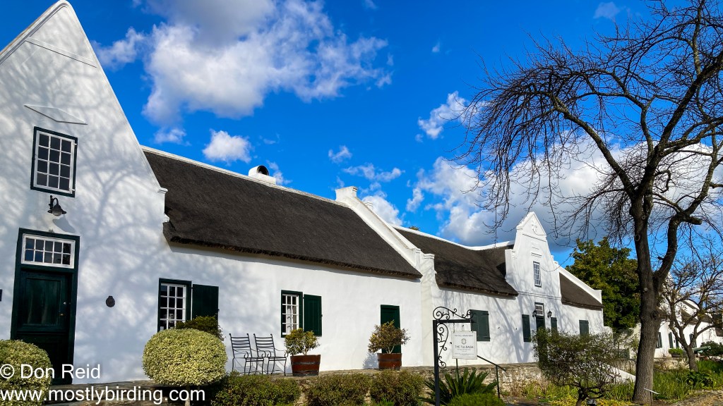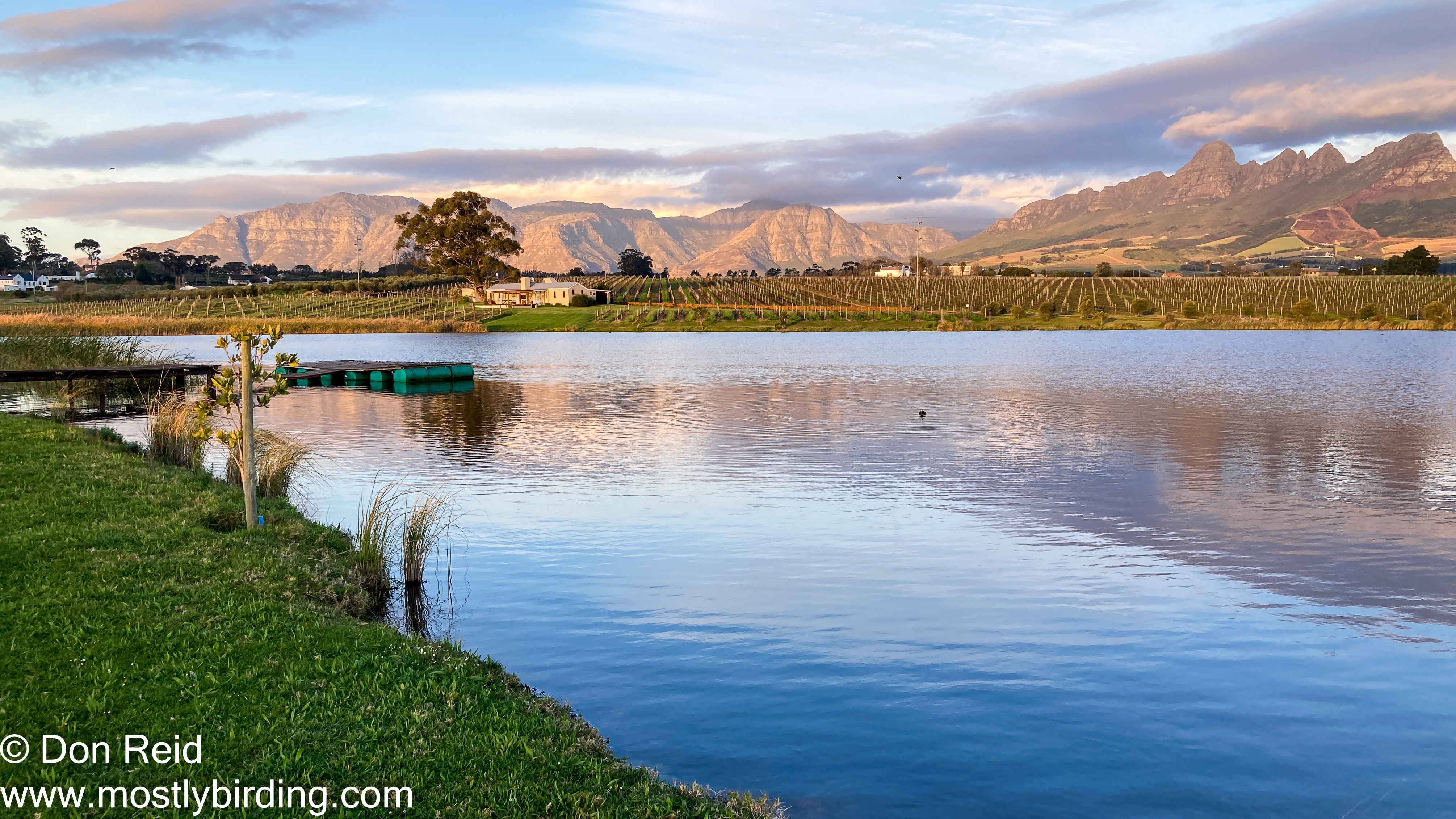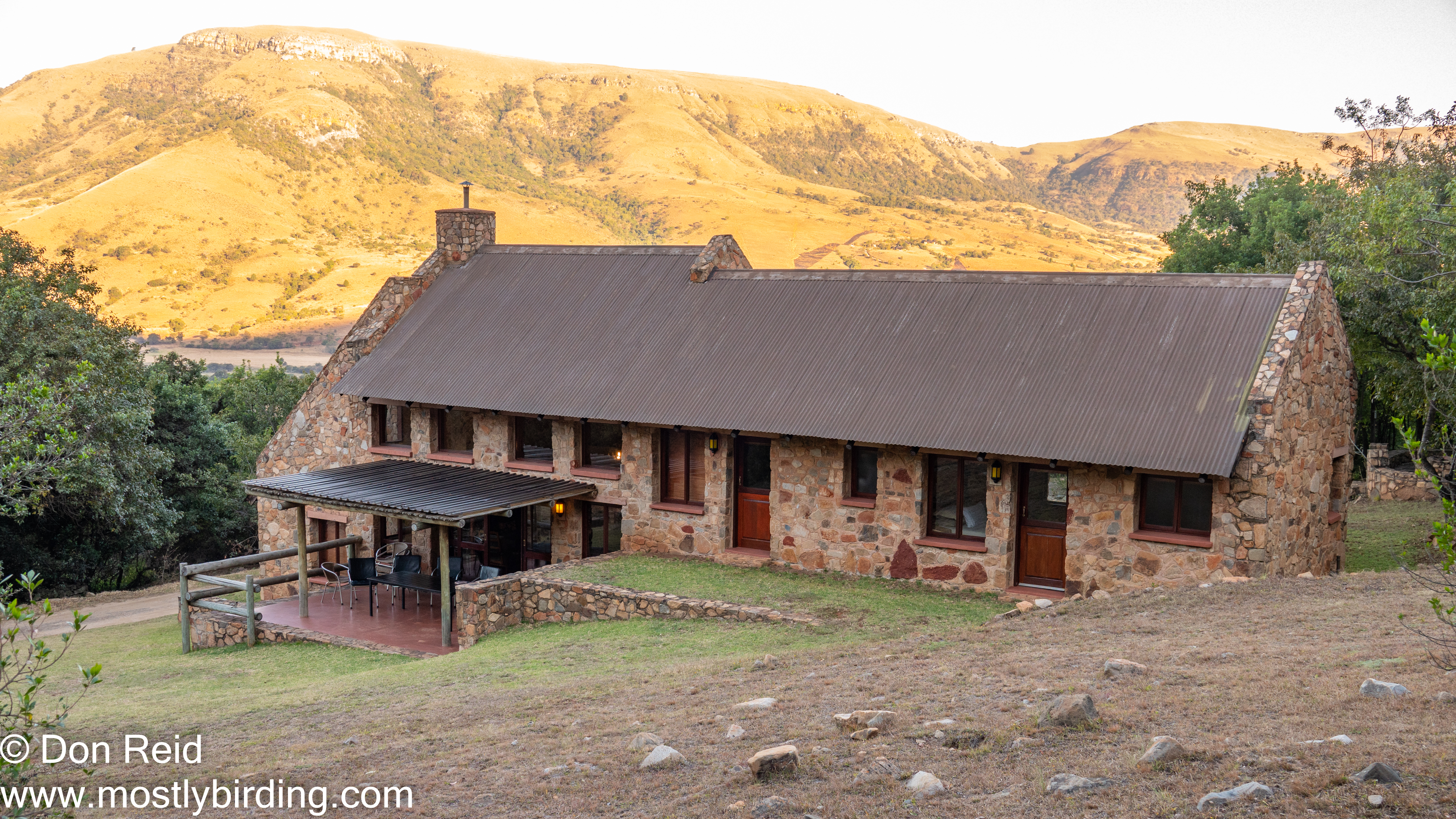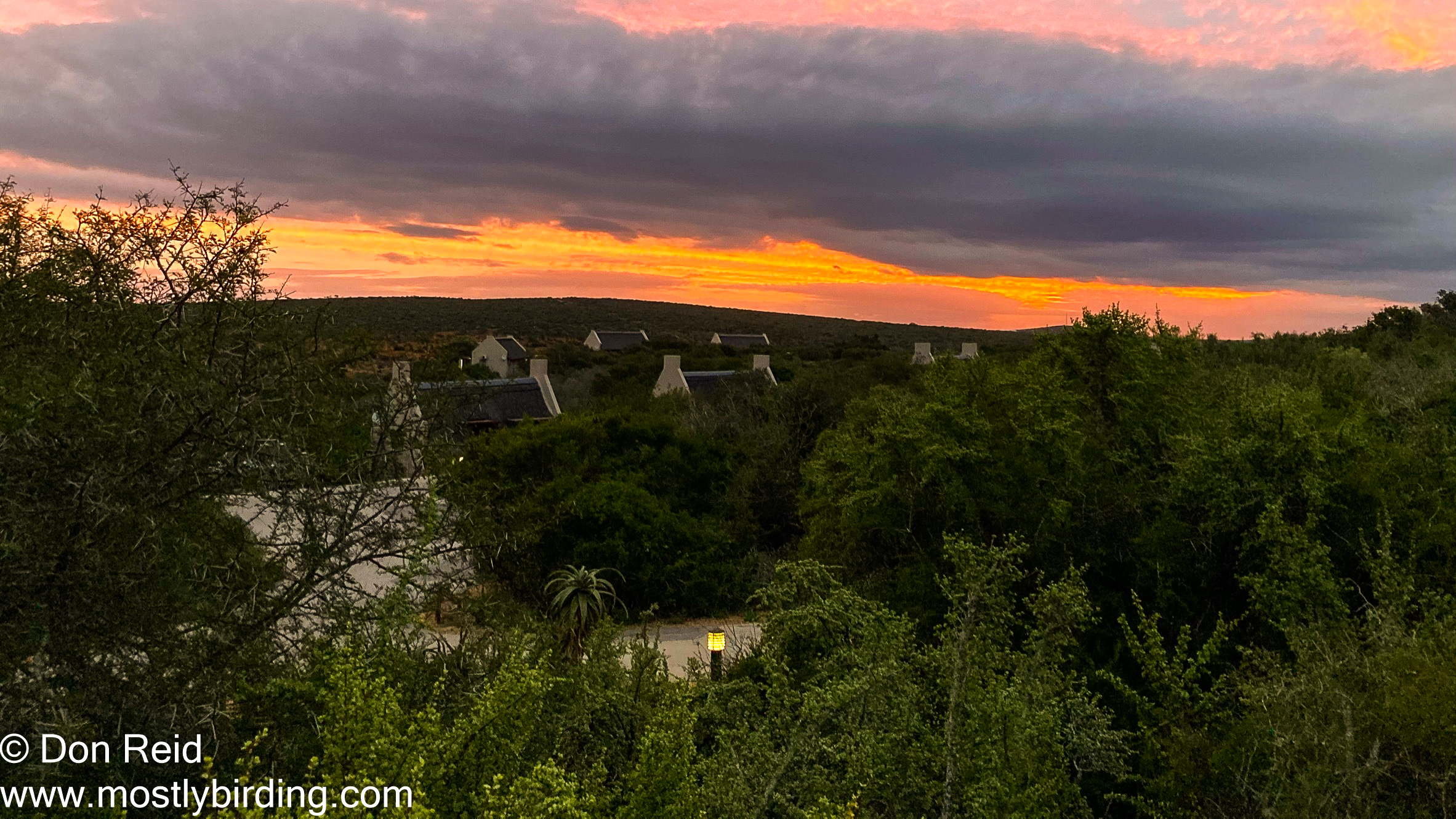 After a brisk walk, the air was suddenly chilly with the sun setting behind the surrounding hills, so I donned a jacket and headed to the stoep for a bit of late afternoon birding. The stoep furniture did not match the rest of the chalet in terms of comfort – in fact I’ll go so far as to say the chairs are possibly the heaviest, most uncomfortable ones I have ever come across. However I didn’t let this small detail bother me and carried one of the living room cushioned chairs outside for that all important sundowner time.