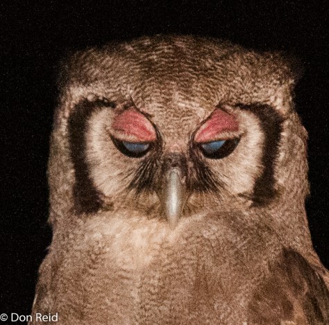 With the evening braai done, we were relaxing on the stoep, sipping our coffee and enjoying a handsome moon rise, when Gerda was first to hear a distant grumpy sound and suggested it was an Owl. We identified the call as that of a Verraux’s Eagle-Owl and I went to investigate when it seemed to be getting closer, finding it in a nearby tall tree, illuminated by neighbouring visitors who had a powerful torch handy. Besides its trademark pink eyelids, this is one impressive Owl, with a length of 62cm (think 6 months old child) and capable of taking prey the size of a half-grown Vervet Monkey or a Warthog piglet but also content to hunt tiny Warblers and insects.