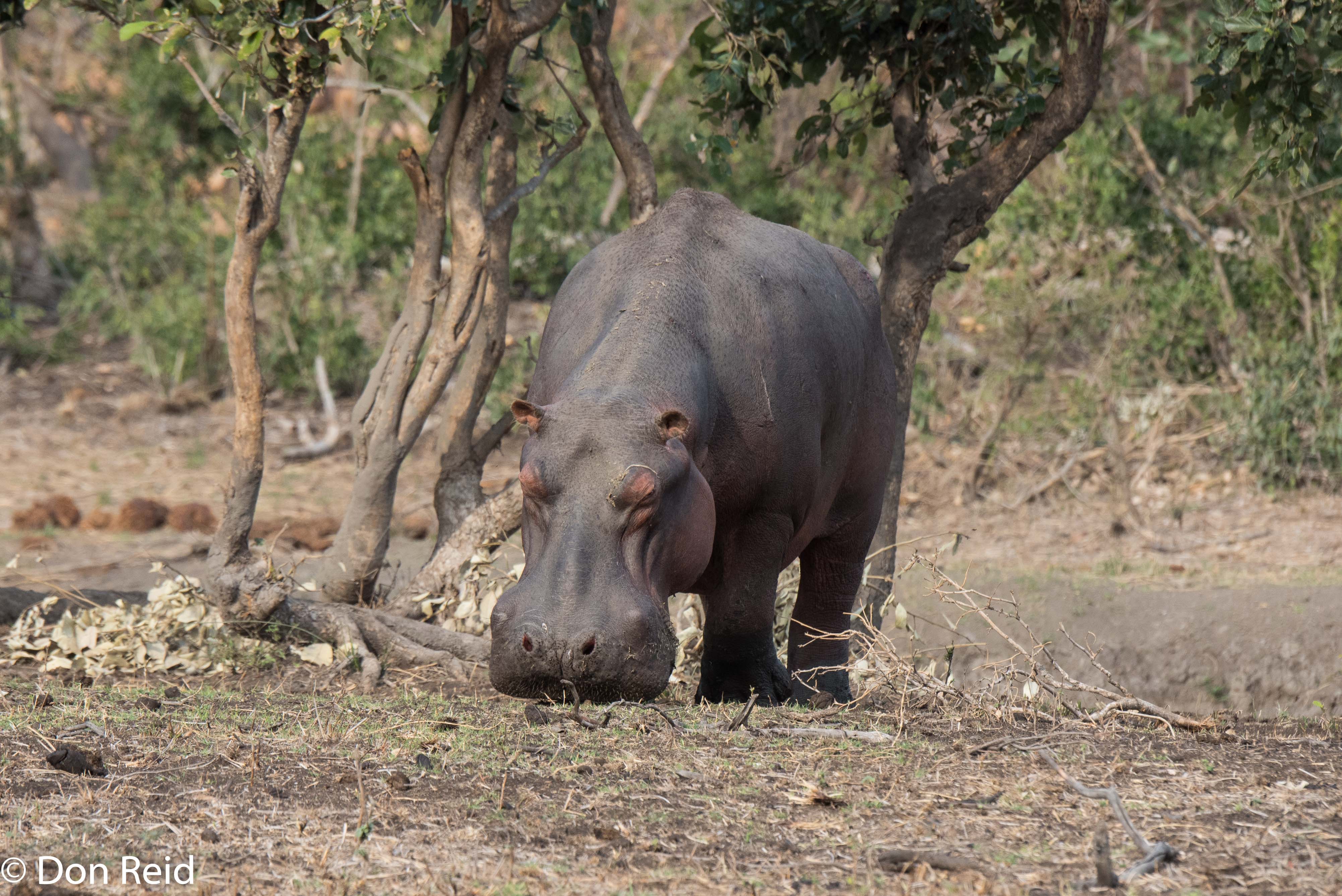 A large herd of Buffalo crossing the road at their usual slow pace caused a minor traffic jam, and a Hippo out of the water presented an unusual sight as it grazed in a grassy spot near the river.