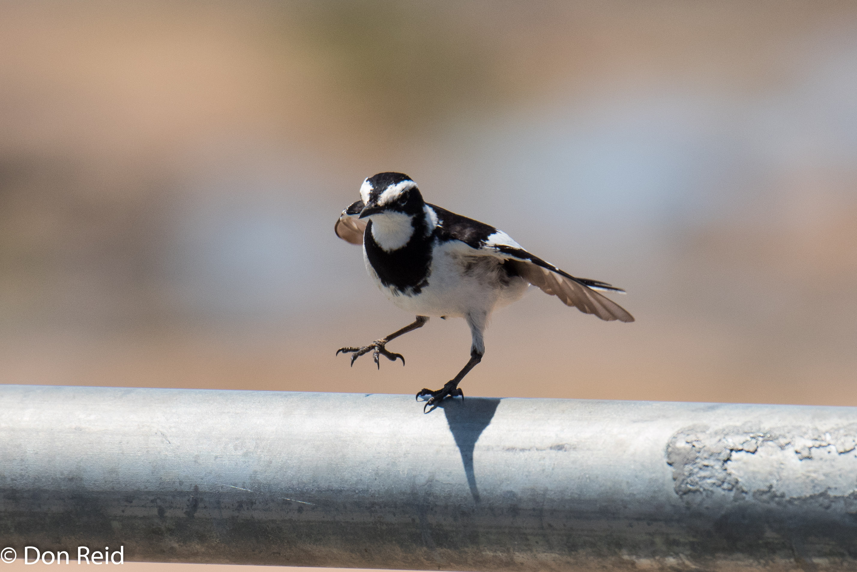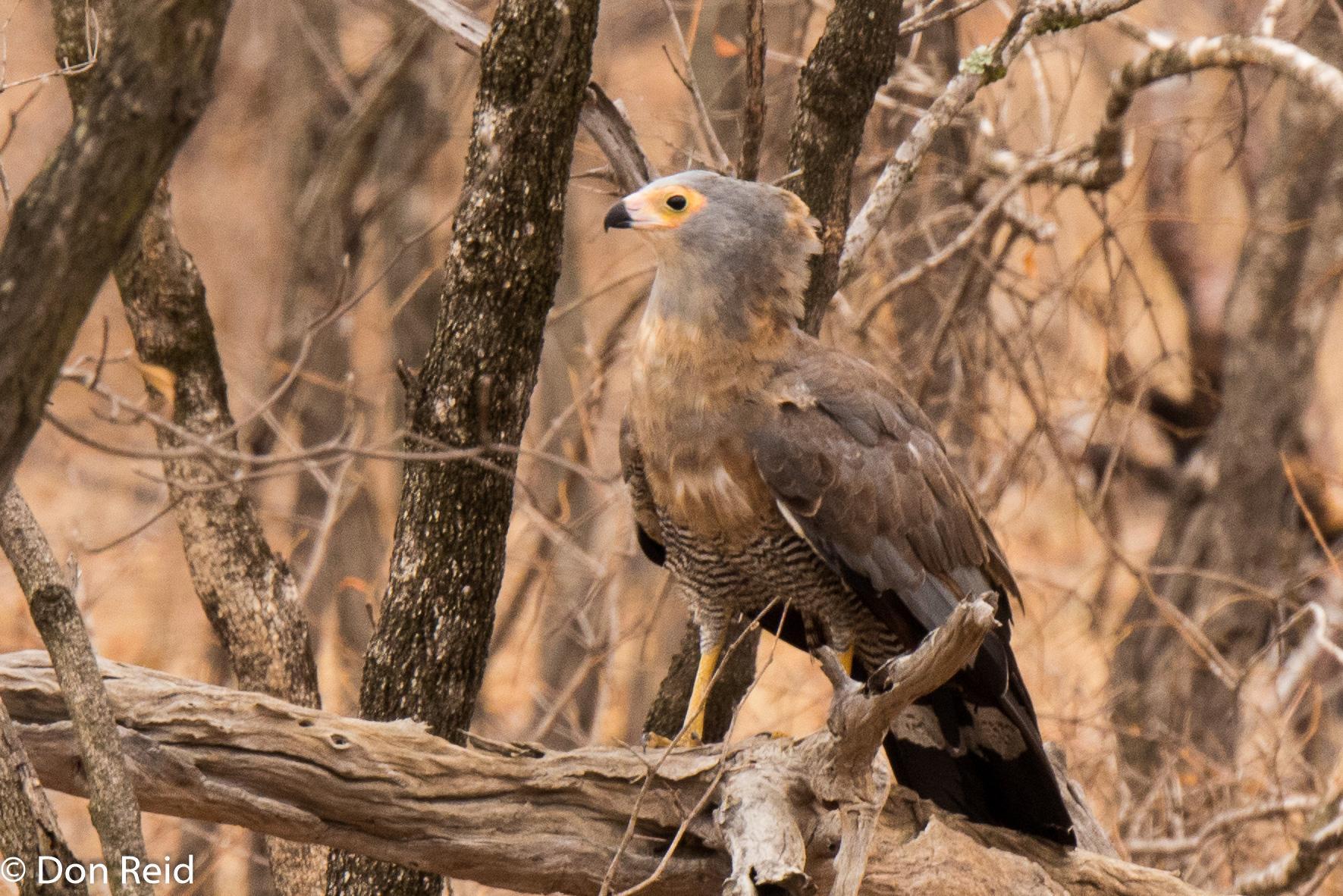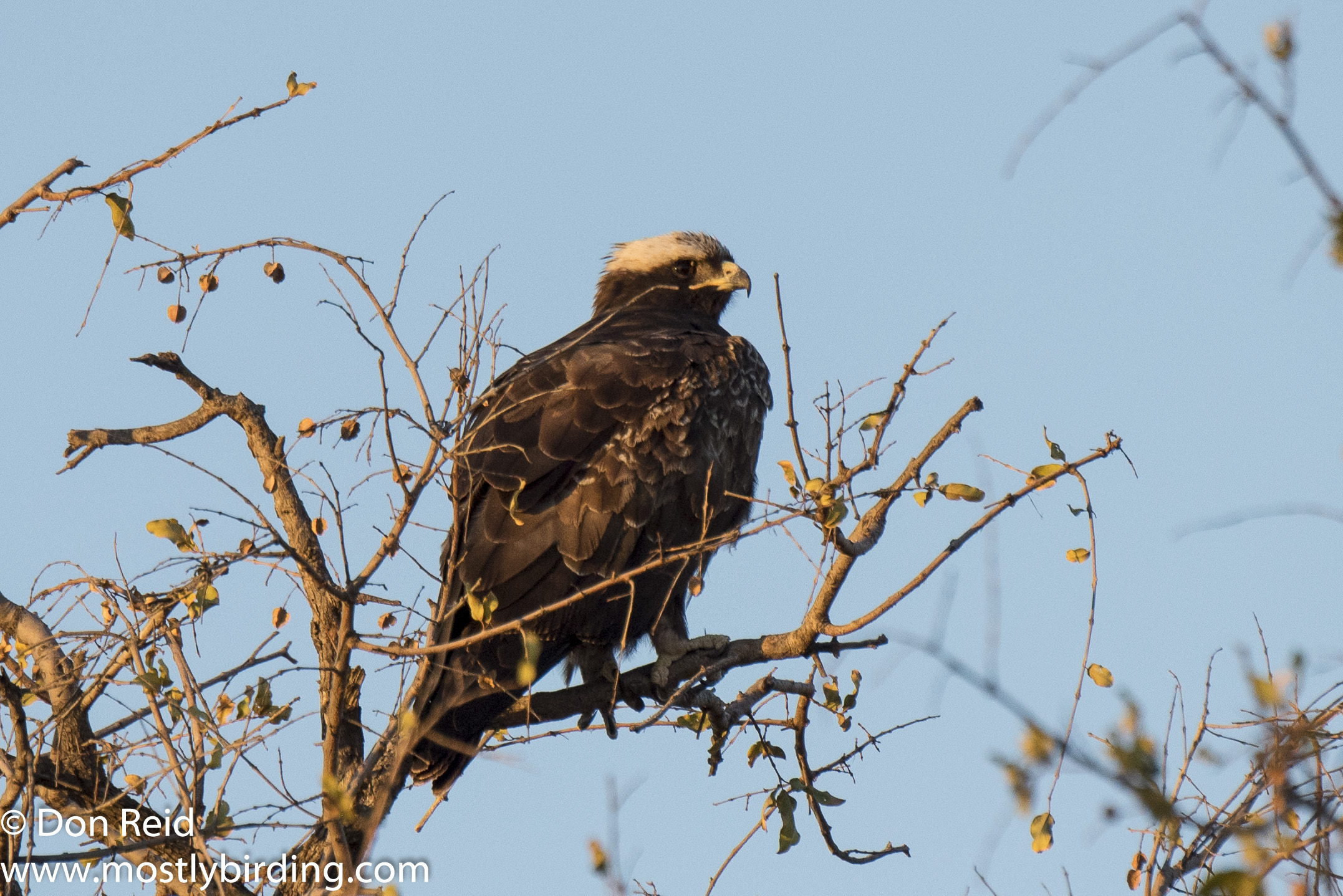 While on the lookout for birds I spotted a raptor in a dry tree near the end of the bridge and was immediately puzzled by its odd appearance – mostly dark brown but with a white crown – nothing like any bird I had seen before. I took a number of photos to help with an ID whereupon the raptor flew off, only to be replaced moments later in exactly the same spot by an adult Wahlberg’s Eagle – reminiscent of a quick-change magic act!