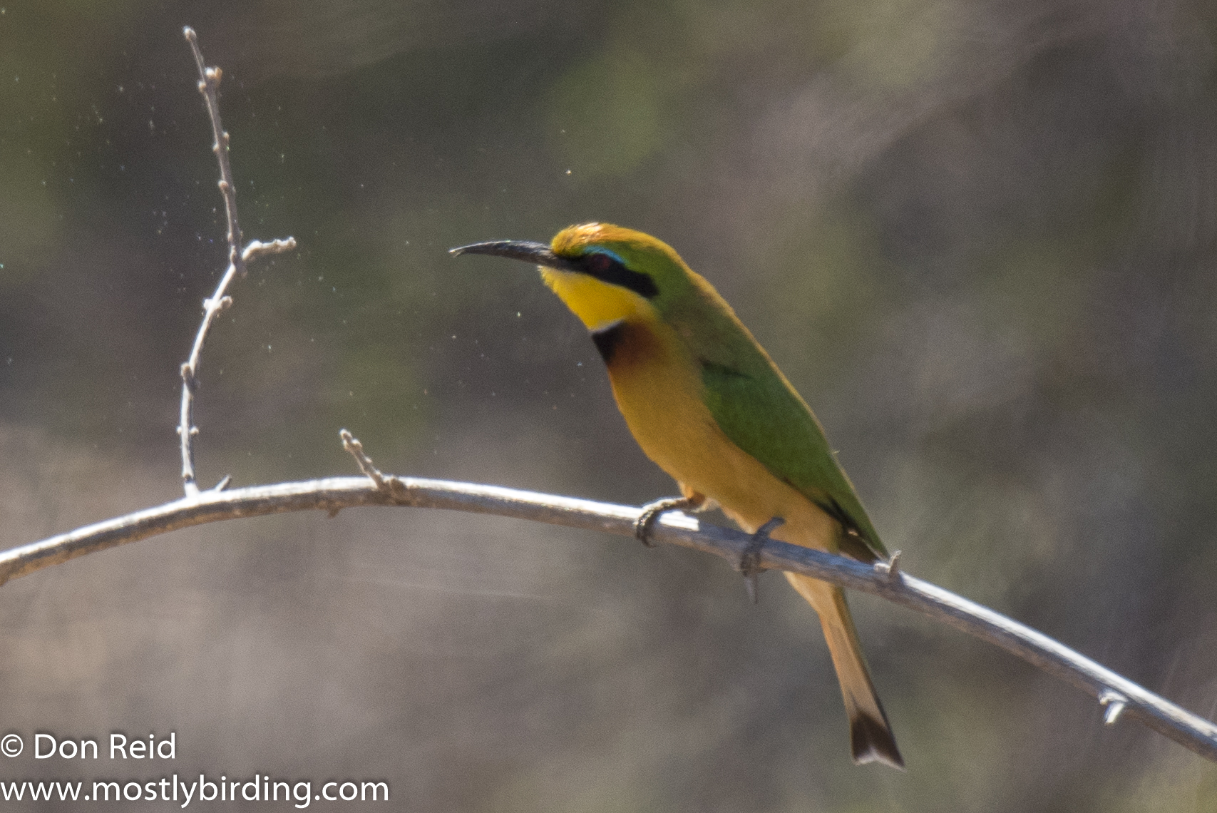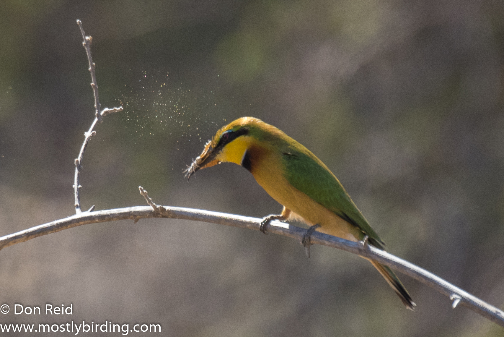 While atlasing along the river towards Letaba, I stopped at one of the turn-offs leading to a viewpoint, when I noticed a Little Bee-eater hawking from a branch then, as they often do, returning to the same spot to look for the next opportunity. As it returned for a third time I focused on it and at the same time noticed it had caught something, so I rattled off a series of shots as it prepared to swallow its prey, hoping for a special photo, although I knew I was not close enough and would have to crop the photos quite substantially to get frame-fillers.