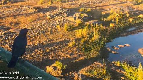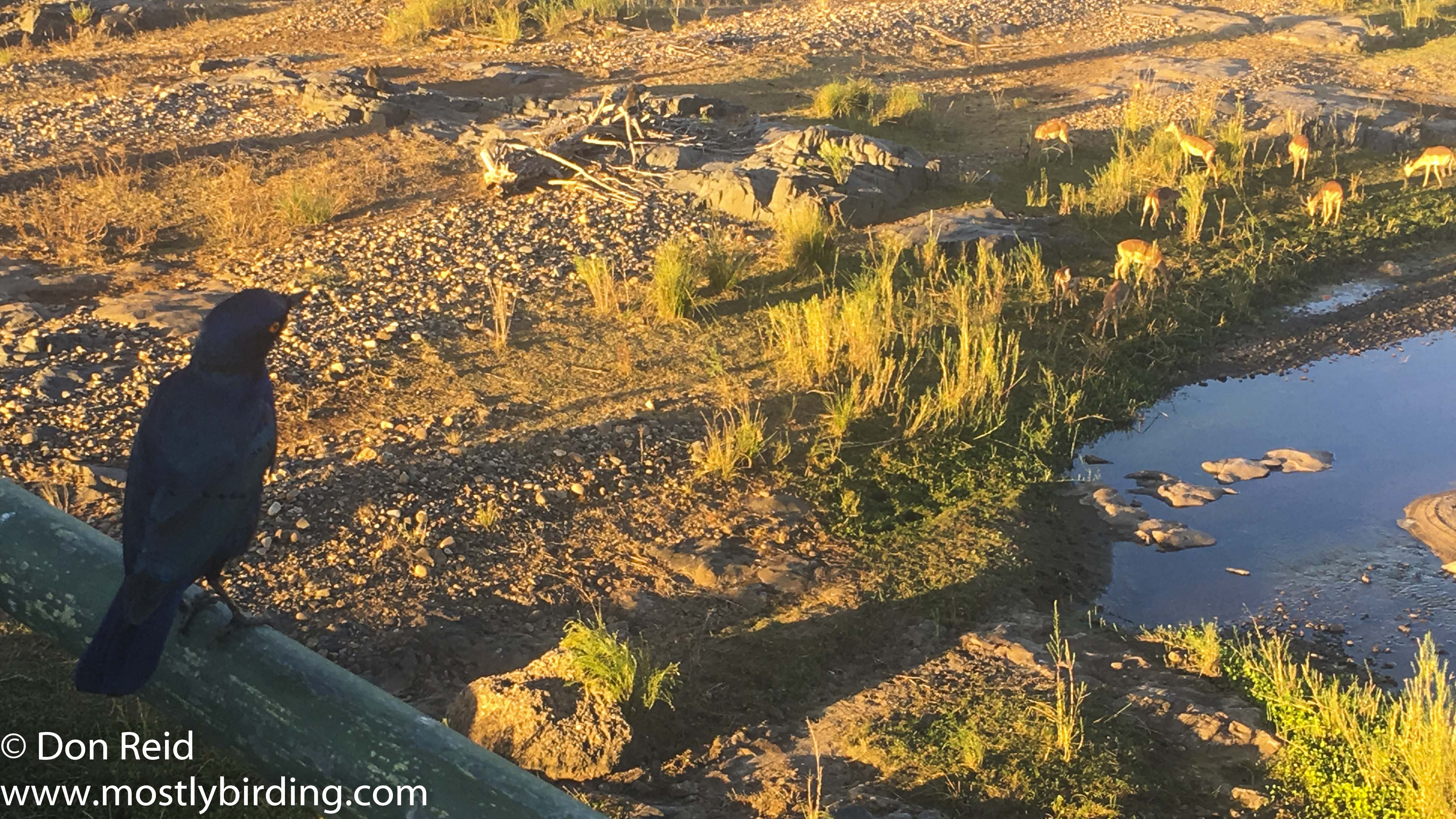 The 10 kms to Berg en Dal rest camp were uneventful with game and birds quite scarce – just a few Giraffe, Kudu and Impala in the greener parts and the bird life mostly confined to the hardier species such as Magpie Shrikes (Langstertlaksman), Fork-tailed Drongoes (Mikstertbyvanger) and Cape Glossy Starlings (Kleinglansspreeu).