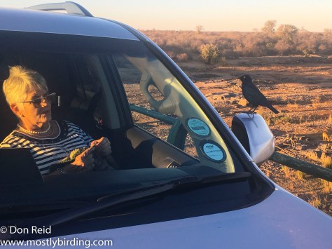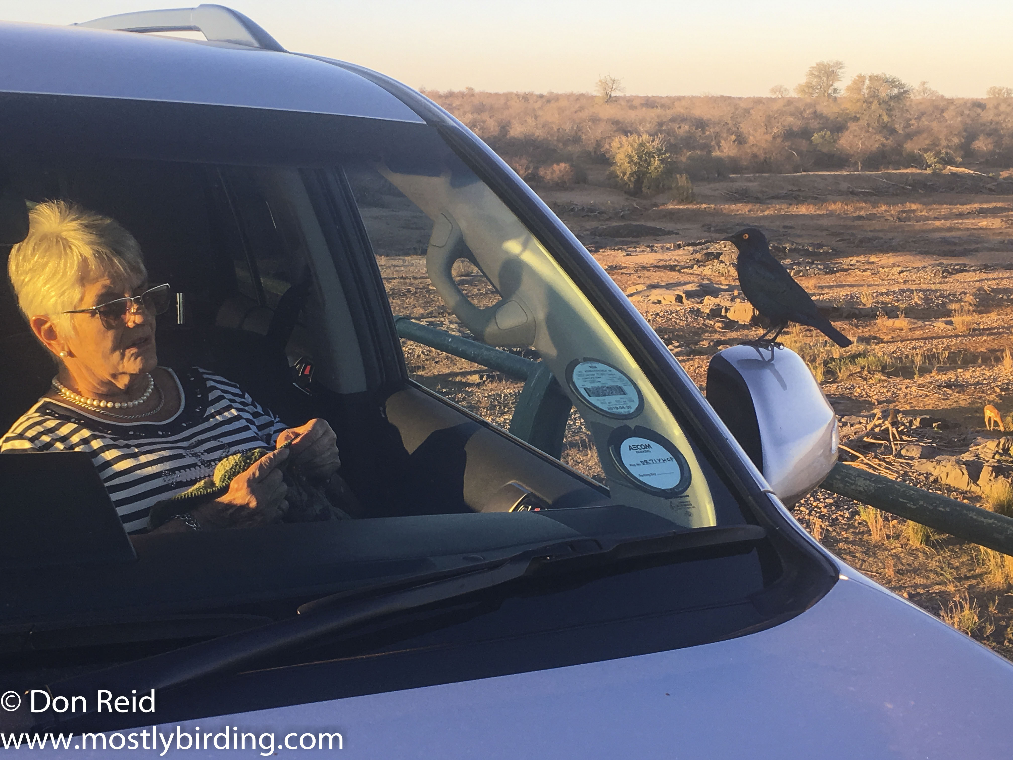 Gerda joined me for an afternoon drive which took us to the main bridge over the Olifants river, a few kms south of the camp turn-off. She ended up “chatting” to a curiously tame Cape Glossy Starling who perched on the railing then, when I got out of the car (permitted on some of the longer bridges), hopped onto the door mirror and seemed to reach out to Gerda with its happy chirping. Perhaps he thought he was on Twitter and was just tweeting the latest news.