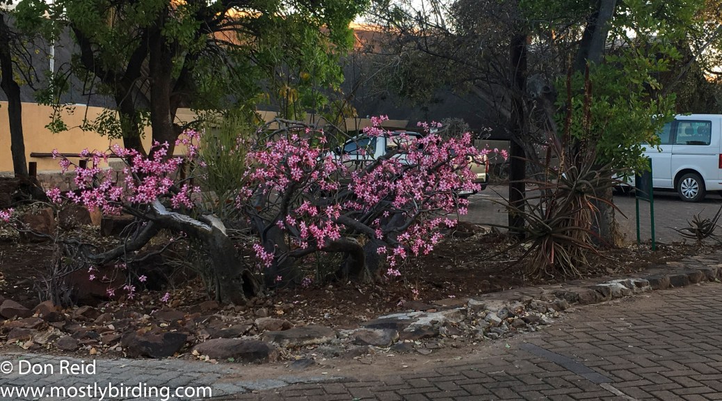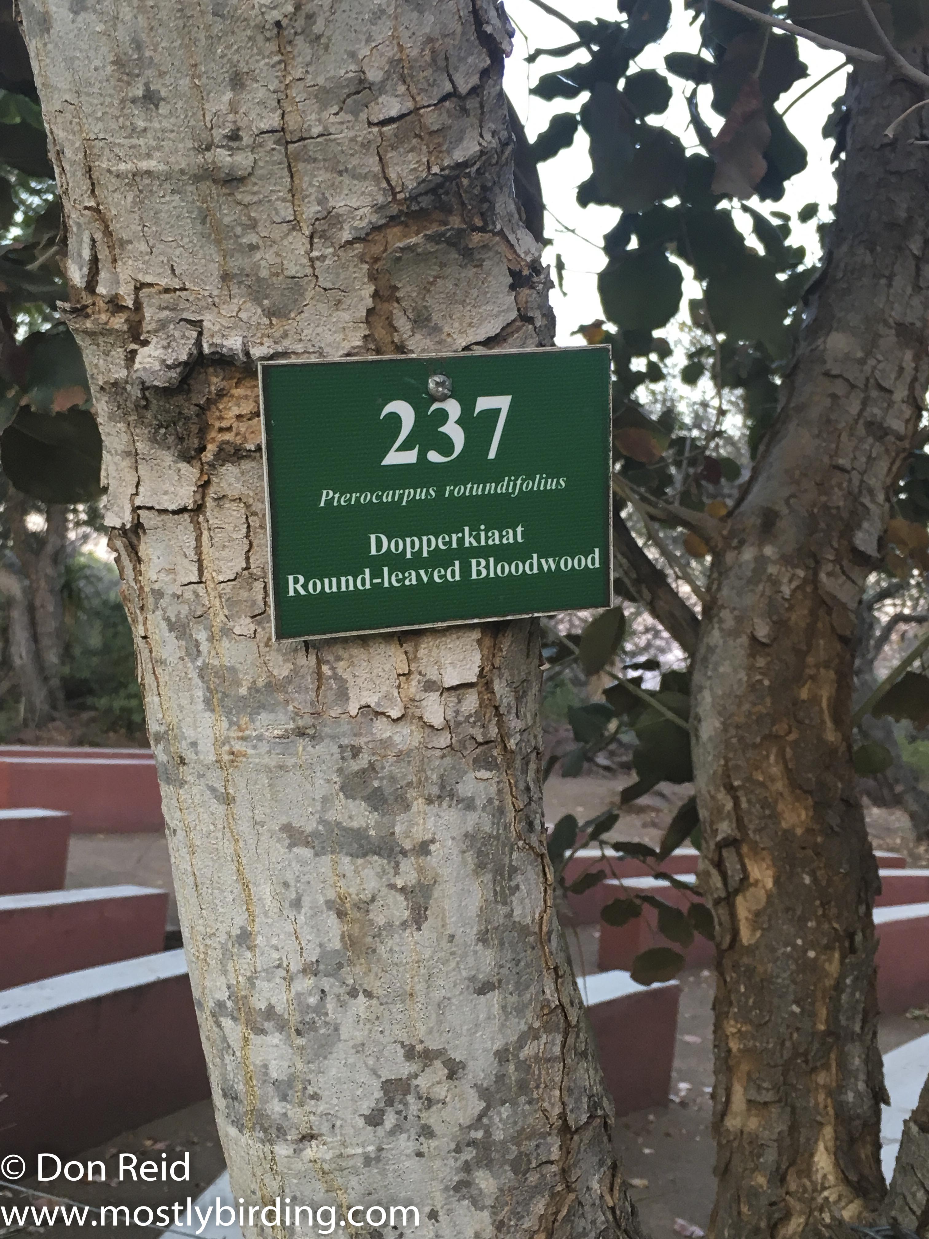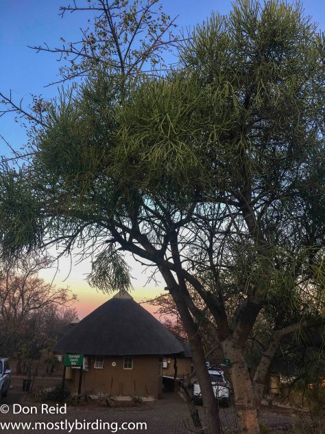 A group of Retz’s Helmet-Shrikes (Swarthelmlaksman) put in a surprise appearance, not staying for long as they moved through the tree canopy in ragged unison. Later a few other calls demanded my attention – Greater Honeyguide (Grootheuningwyser) with its “Victorrrrr”, Arrow-marked Babblers (Pylvlekkatlagter) as raucous as ever, good old Hadeda Ibises (Hadeda) outdoing the others in sheer volume and the shrill call of a Water Thick-knee (Waterdikkop) near the Reception. After dark it was the turn of the African Scops Owl (Skopsuil) to take over night duty with its soft “prrrtt” call carrying far through the camp gardens.