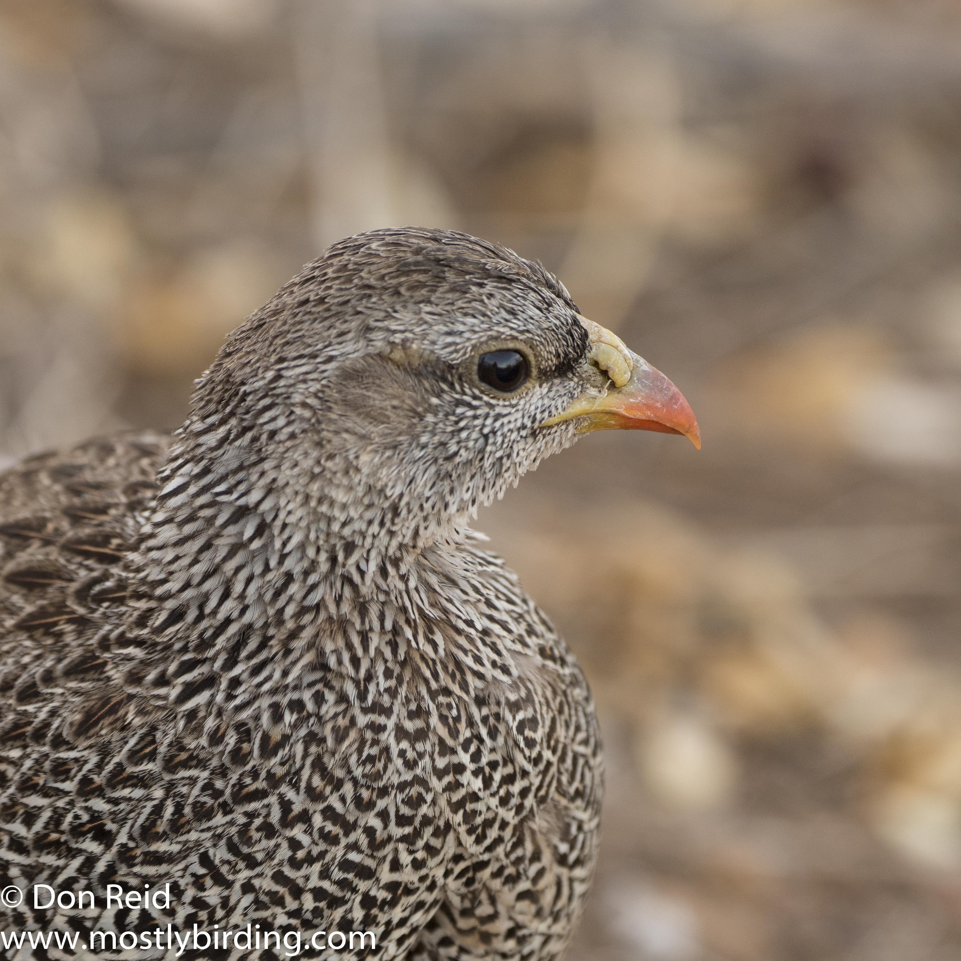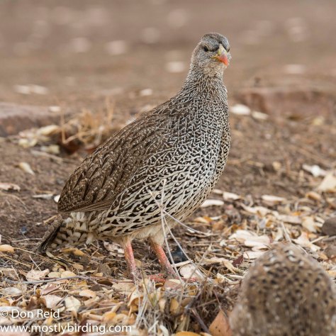 a Natal Spurfowl mommy with 4 teeny bopper youngsters spent time scratching in the dry leaf litter and dust bathing
