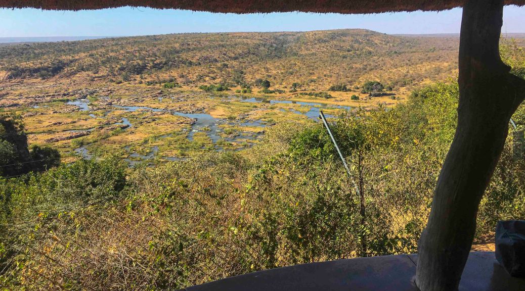 When we arrived at Olifants and drove to our rondavel after checking in, we were thrilled to see just how good our “river view” was – a view that started with the fence a couple of metres away, then dense bush and trees all the way down the steep slope to the river far below, where we could already make out an elephant or two and some hippos in the pools that form amongst the rocky course of this iconic river.