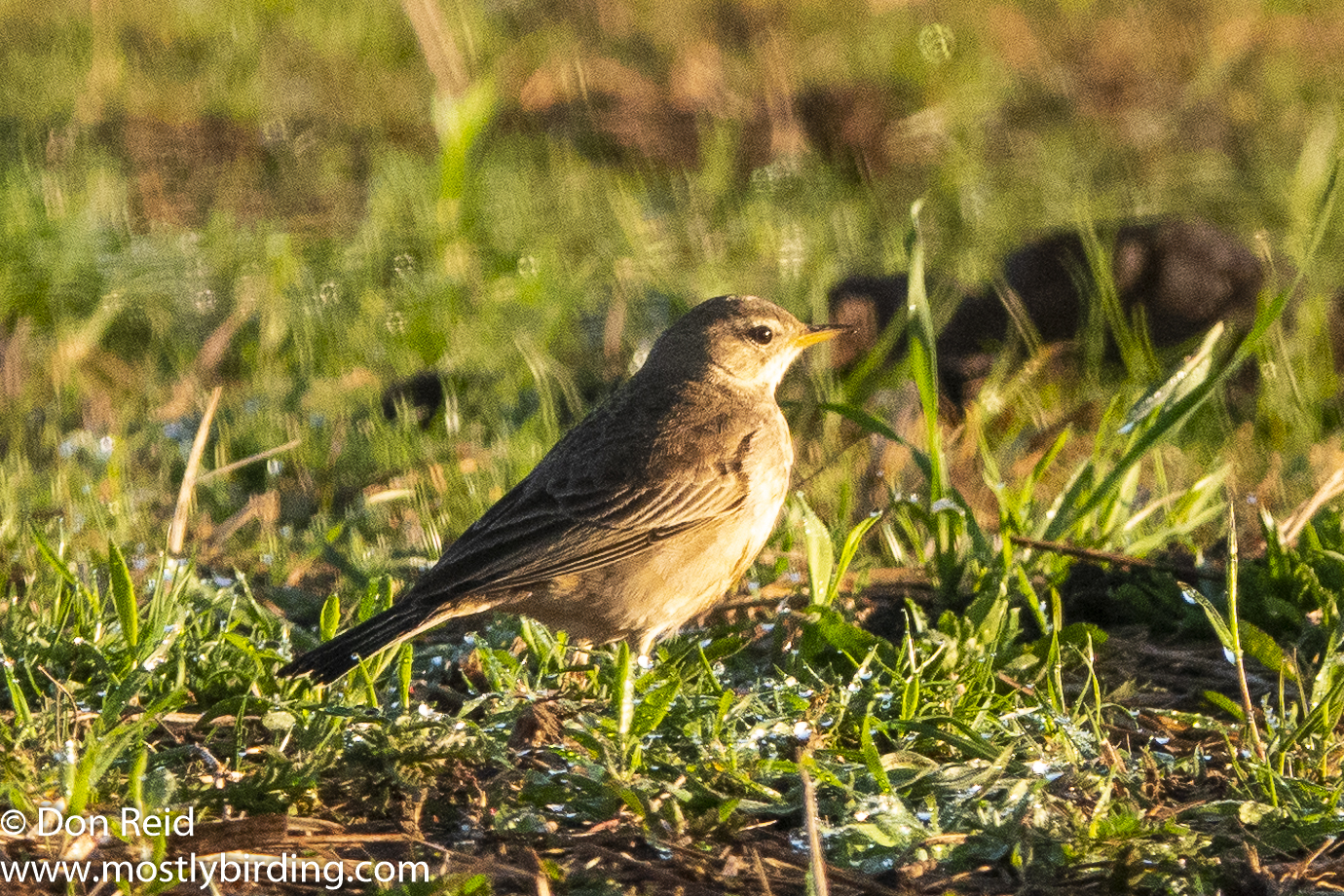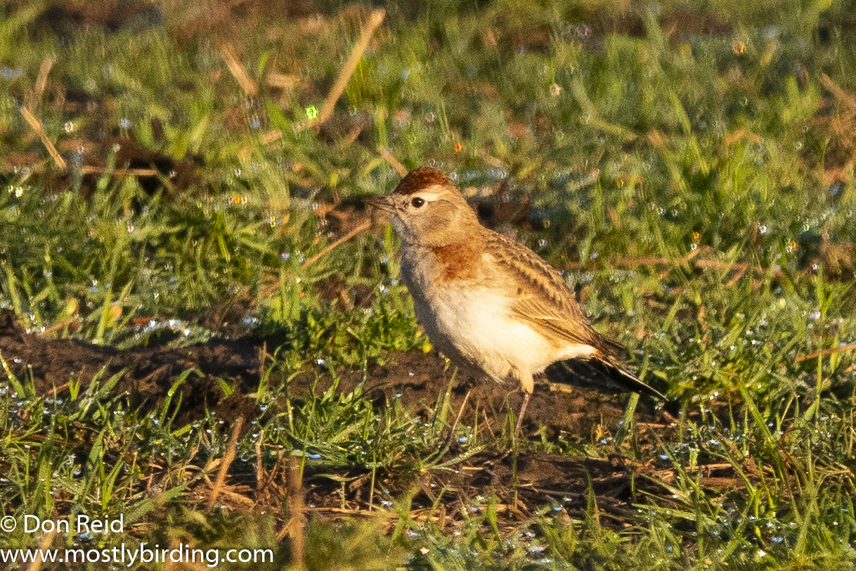 The Buff-breasted Sandpiper was quickly pointed out by those already present – on its own foraging in the dry, lightly grassed area away from the water – clearly a loner not interested in mingling with the many other waders in the vlei itself.