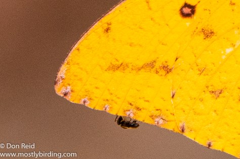 Zooming in to see what that dot on the wing edge is, revealed a tiny flying insect, not more than 1 mm long, clinging to the butterfly