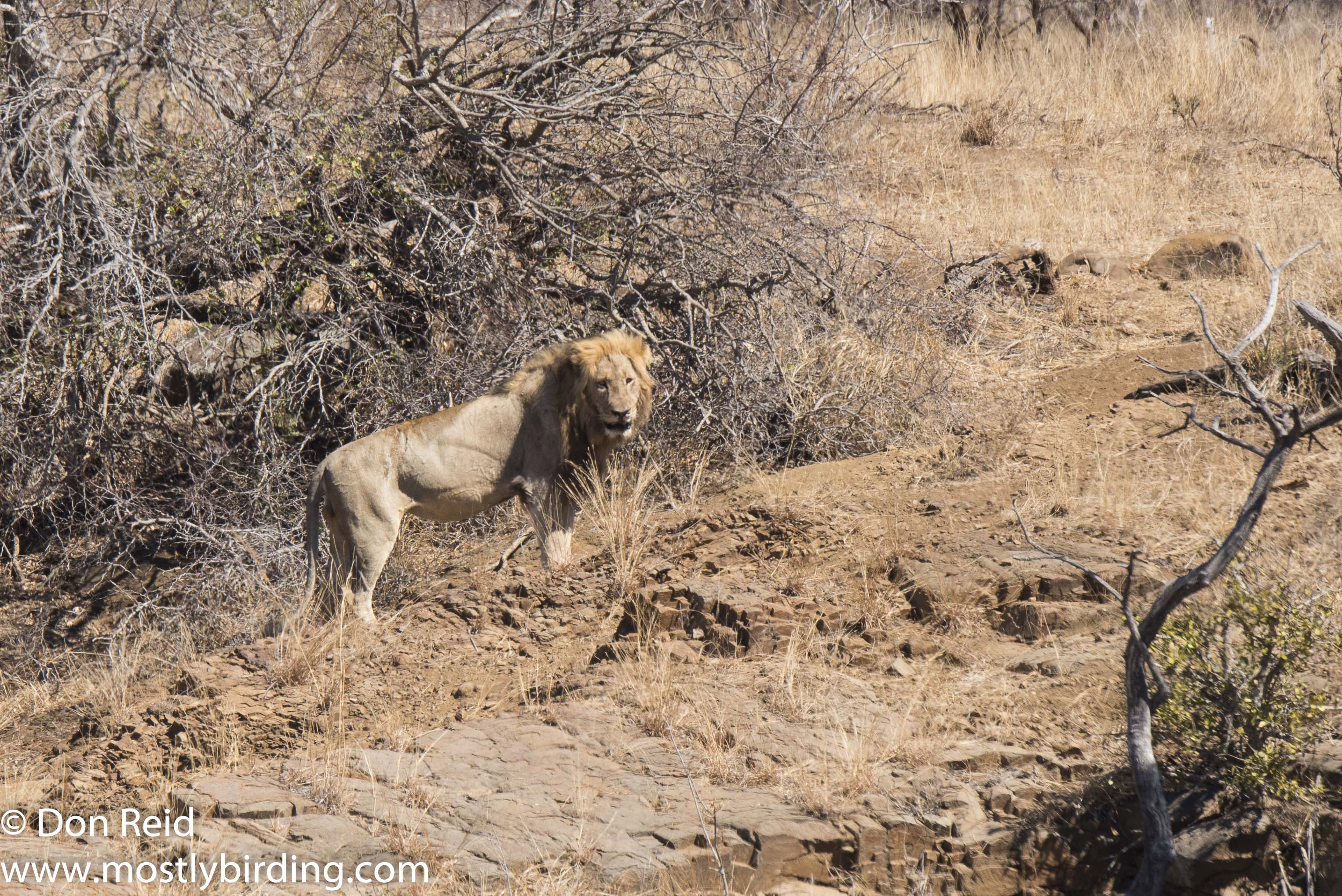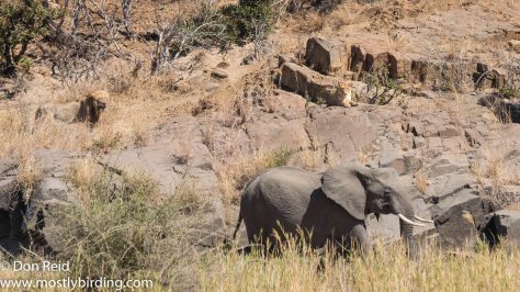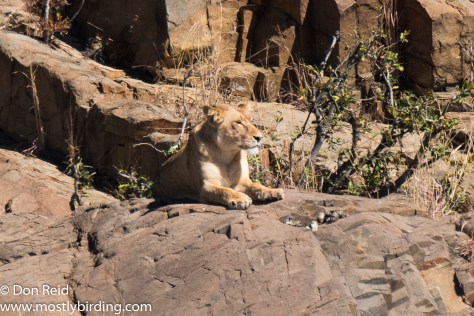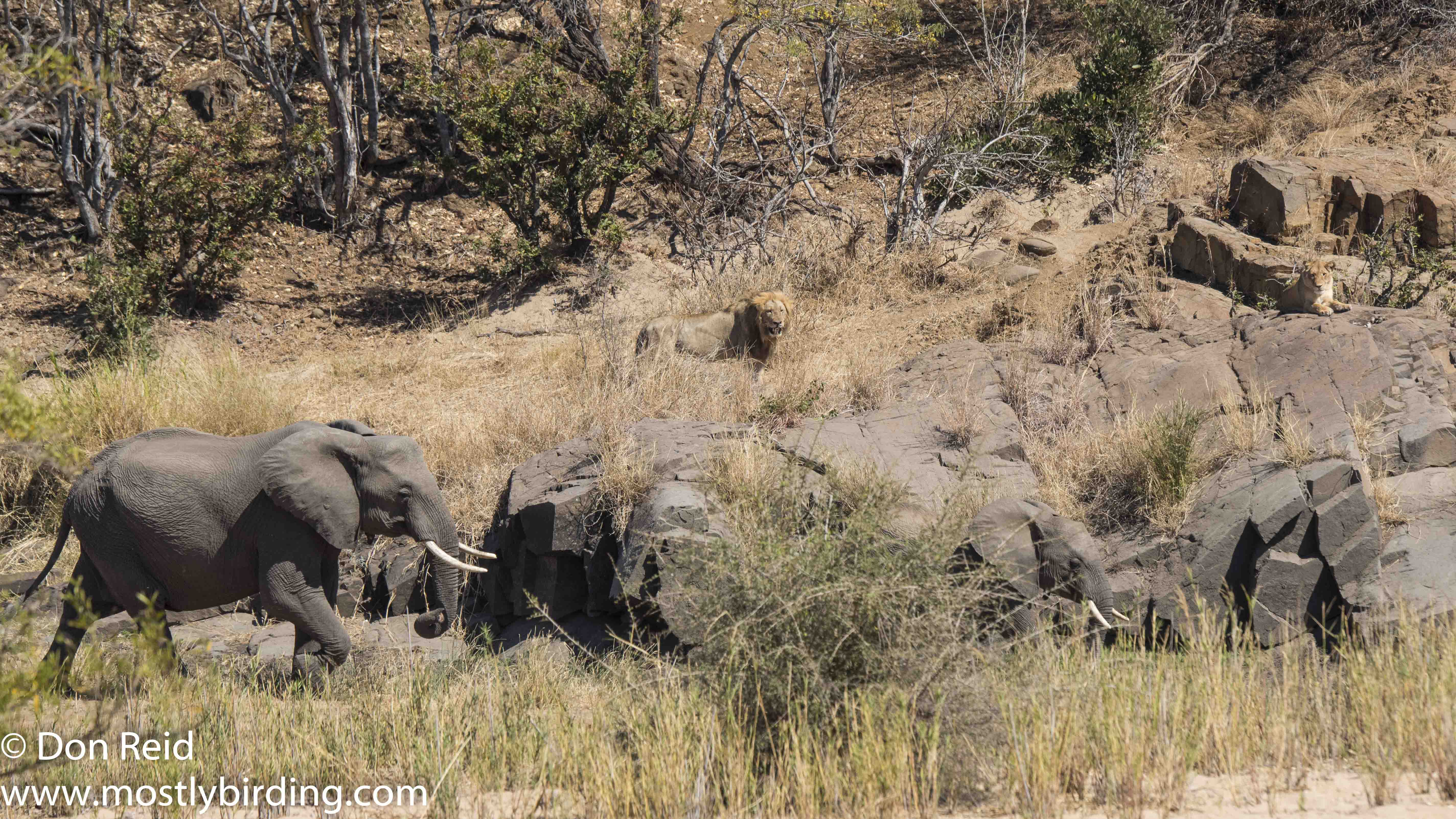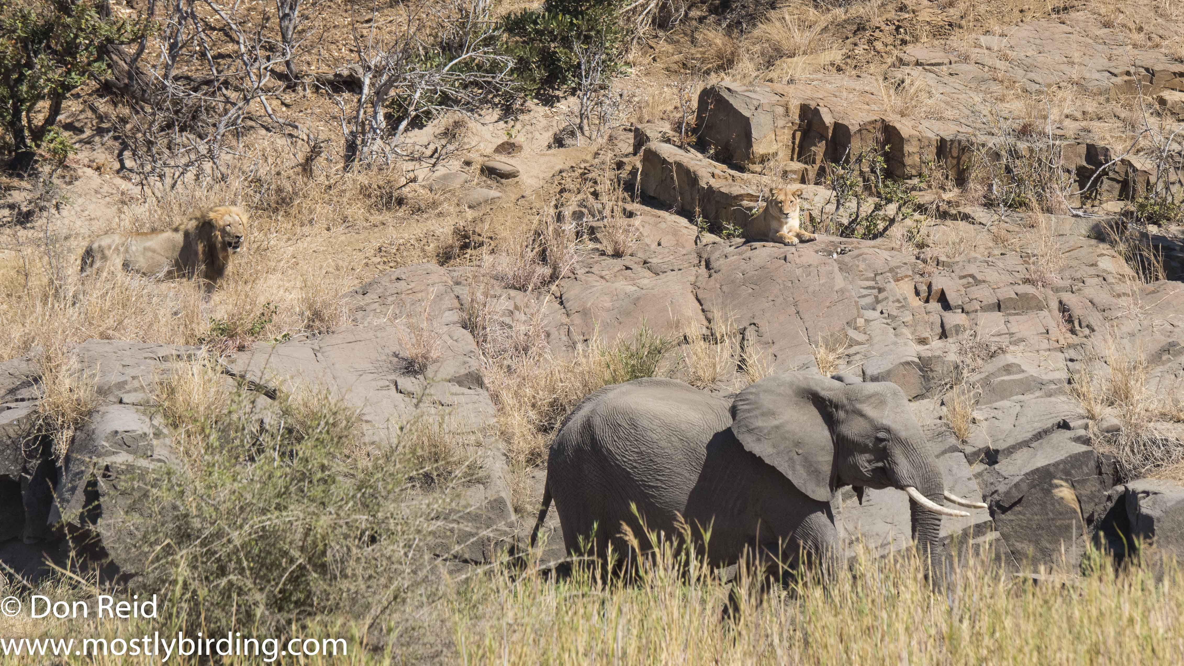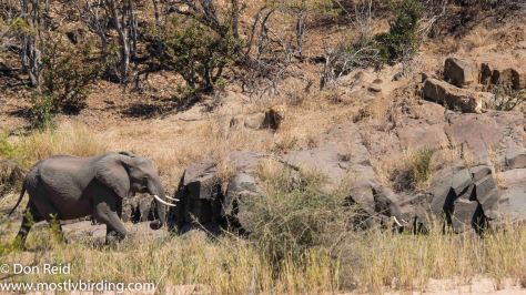 We watched as they came closer, ambling along the river bed in their slow, measured fashion one by one. Just then Gerda exclaimed “lions” and there they were, a male and two females further up on the opposite bank of the river, looking magnificent against the backdrop of the rocky bank and watching carefully as the elephants passed by below them.