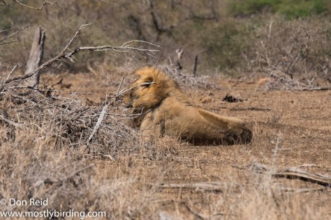 Not long after, a chatty guy in a Land Cruiser with family on board stopped us to ask where we had hidden all the lions. We chuckled and carried on, only to be stopped again by the same chap, now parked at the side of the road and gesticulating towards a nearby tree, where we soon saw the object of their excitement – a male lion resting not far from the road.