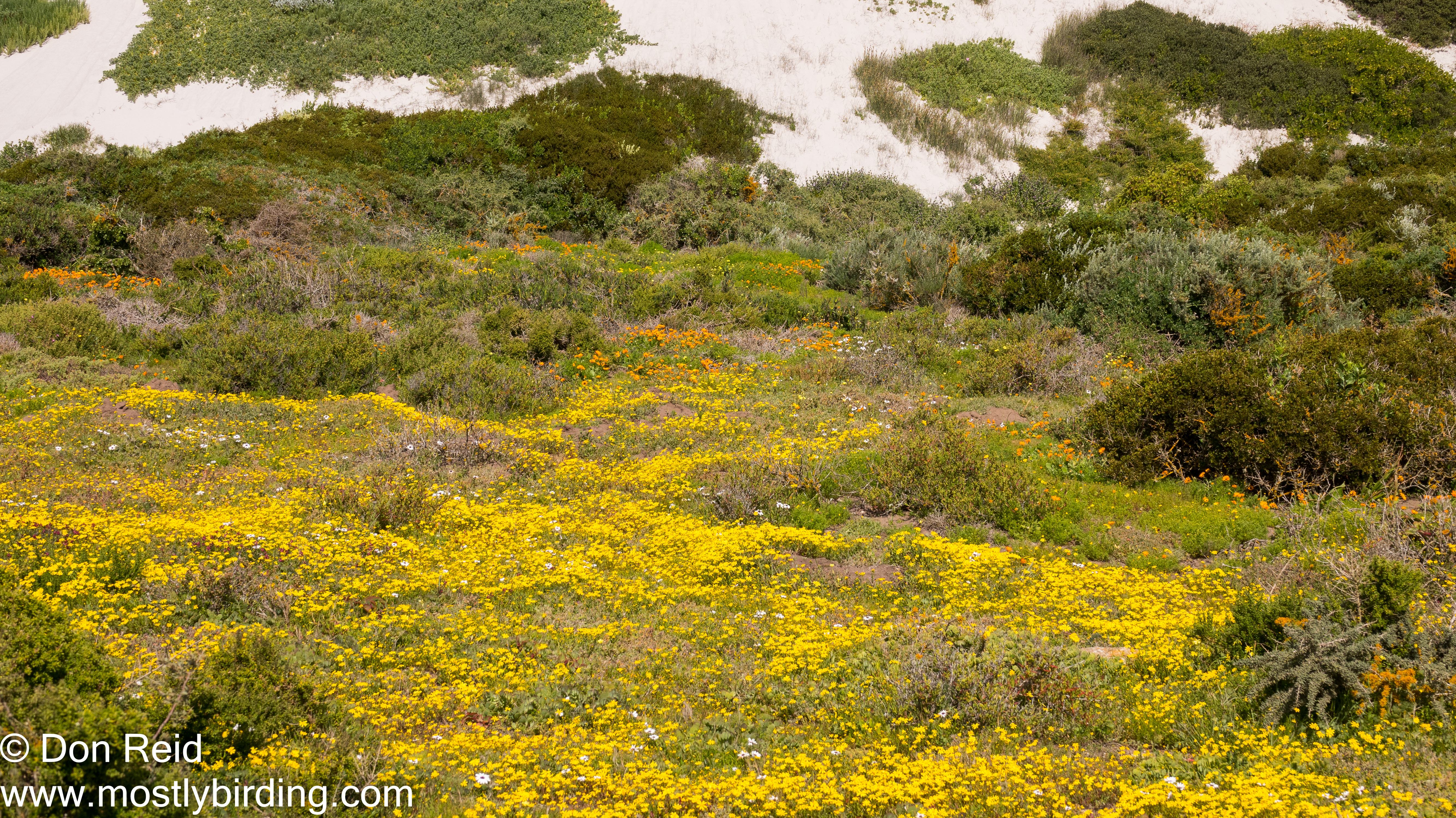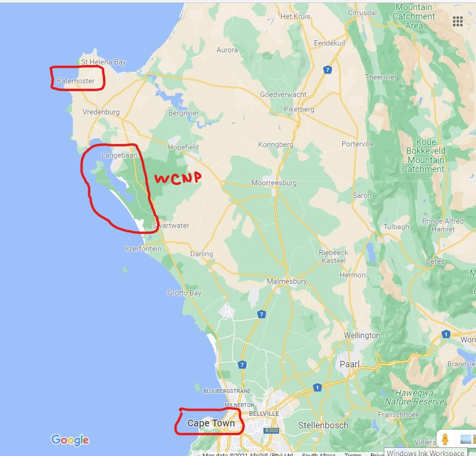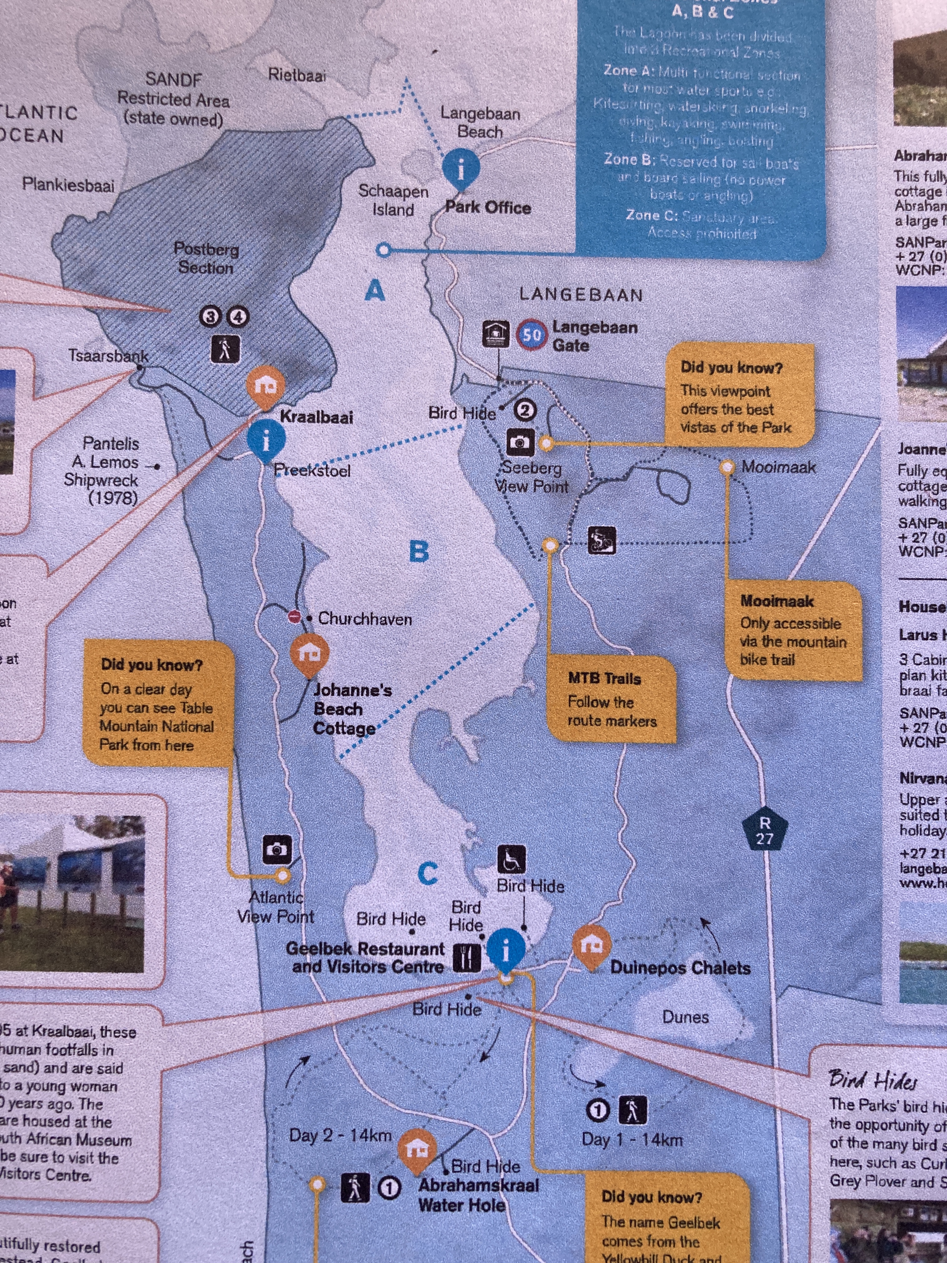 Fortunately, as it turned out, we decided to head to the Langebaan gate of the Park after our last breakfast at Paternoster Dunes Guest House, and ‘play it by ear’ as to how much of the Park we would have time to explore, bearing in mind the distances involved in getting to the Postberg section of the park, which is only open during the flower season months, and the numbers of other flower viewers we were likely to encounter.